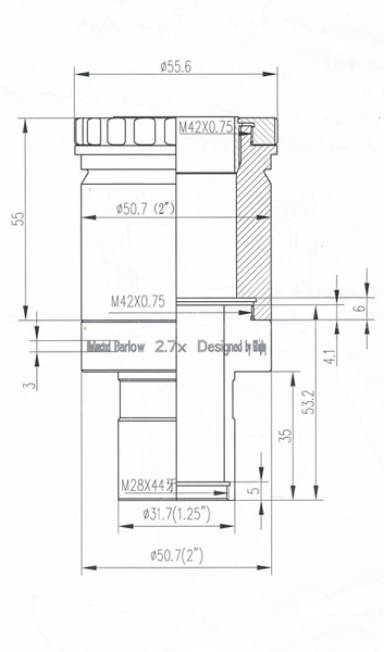 Die komakorrigierende APM Barlowlinse mit 2.67x Faktor (apochromatisches, verkittetetes Doublett mit FK-61) wurde von Gerd Düring in Deutschland gerechnet. Die Barlowlinse nutzt das ED Glas FK61 (vergleichbar mit Ohara FPL51) , besitzt geschwärzte Linsenränder und eine Breitbandmultivergütung mit einer Transmission von bis zu 99%. Die Barlowlinse ist optimiert bis zu F/4 Newton Teleskopen, funktioniert daher auch mit allen langsameren Öffnungsverhältnissen.
