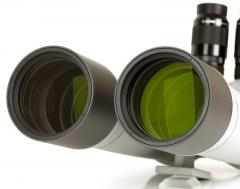 Die Semi-Apo-Objektive aus Spezialgläsern ermöglichen eine farbreine, unverfälschte Abbildung mit hohem Kontrast. Das Gehäuse ist wetterfest und die Stabilität des Magnesiumgehäuses ist beeindruckend. Ausziehbare Taukappen schützen die Objektive auch bei langen Beobachtungen vor Taubeschlag und können bei Tage als Seitenlichtblende dienen. Dieses Fernglas verfügt natürlich über einen Stativanschluß sowie einen robusten Tragegriff. Diese Geräteklasse kann noch problemlos auf Fotostative montiert werden. Natürlich können mit diesen Geräten auch terrestrische Ziele bestens beobachtet werden. Durch den Okularwechsel sind diese Ferngläser wesentlich flexibler als festvergrößernde Modelle.