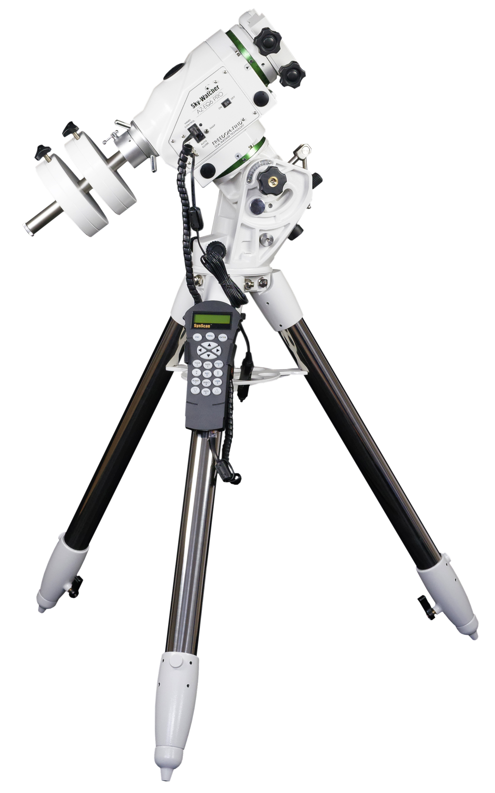 Die AZ-EQ6-pro hat eine Polhöheneinstellung von 0 bis 90 Grad, und besitzt an beiden Achsen Encoder. Auch bei einer manuellen Verstellung verliert die Montierung dadurch die GoTo-Orientierung NICHT! Die visuelle Tragfähigkeit ist dank des verstärkten Polblocks grösser als bei der EQ6 (20kg). Die inneren Getriebe sind durch Zahnriemen ersetzt, und daher ist die Nachführung deutlich präziser als bei der EQ6. Es ist die modernere und komfortablere Version des alten Veterans, welche vor allem für Langzeit-Fotografie sehr empfehlenswert ist.