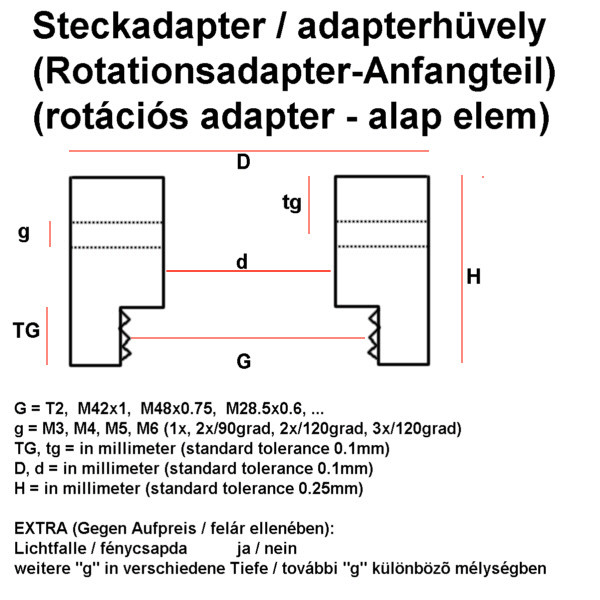Ihre Sonderbestellungen können Sie per ONLINE-SHOP mitteilen! (Warenkorb anklicken und beim ANMERKUNGEN-FELD einen Link zu ihrer Zeichnung setzen oder den Adapter genauest beschreiben. (max. 1000 Buchstaben)