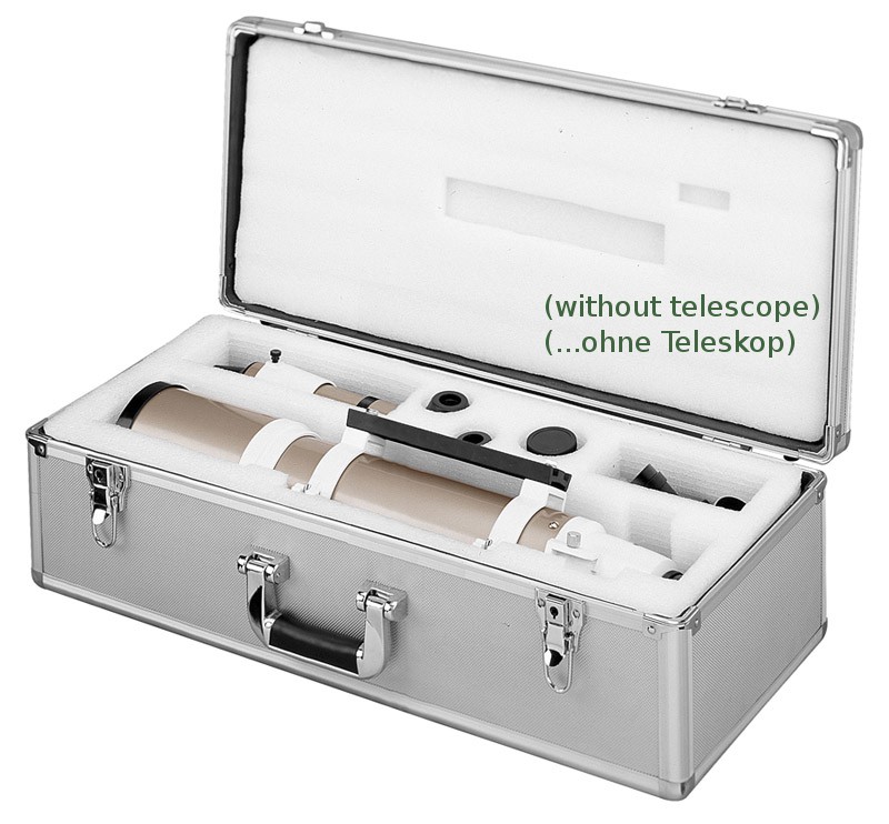 Dieser formschöne, stabile und praktische Alukoffer ist für den SkyWatcher 80/600 APO (mit oder ohne Mikrofokus) gedacht. Es passen jedoch auch andere Refraktoren bis ca. 80mm Durchmesser und max. 600mm Brennweite in den Koffer.