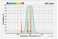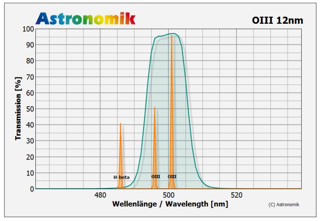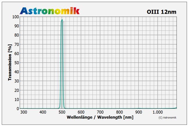 Dieser Filter ist geeignet für die Photographie von Nebeln aus kunstlichtverschmutzten Gebieten aber auch von Orten mit dunklem Himmel. Die Kontraste zwischen Objekten, die im Licht der OIII Linie leuchten und dem Himmelshintergrund werden extrem verstärkt.