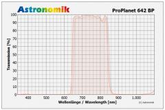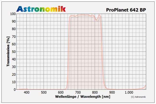 "BP" ist eine Abkürzung für "Bandpass": Der Filter öffnet bei 642nm und schließt wieder bei 842nm, er sperrt im Gegensatz zu den beiden anderen ProPlanet Filtern das langwellige Infrarot. Zusammen mit den Astronomik Filtern ProPlanet 742 und ProPlanet 807 können Sie für Aufnahmen im Infraroten jetzt drei Wellenlängenbereiche wählen, um optimale Bilder zu erhaltenHighlight des Astronomik ProPlanet 642 BP: Drei Filter in einem!