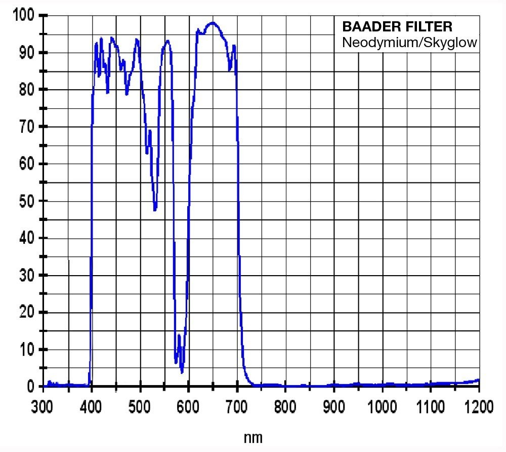 Drastische Kontraststeigerung für alle Teleskope, ohne Verlust an Bildhelligkeit! Dieses Filter geht zurück auf eine Entwicklung von Carl Zeiss. Der Effekt des Elements Neodymium als Filtermaterial ist sehr beeindruckend. Als Beimischung zu optischem Glas steigert es Kontraste, verstärkt den roten Farbanteil im Bild (besonders bei Mars und Jupiter) und dunkelt gleichzeitig nachts den Spektralbereich ab, der besonders unter dem Licht vieler Straßenlampen leidet und der am meisten für die Lichtverschmutzung – das nächtliche „Skyglow“ – verantwortlich ist.