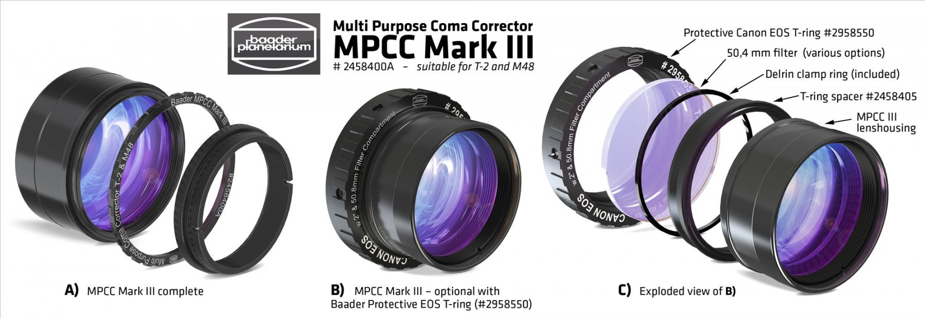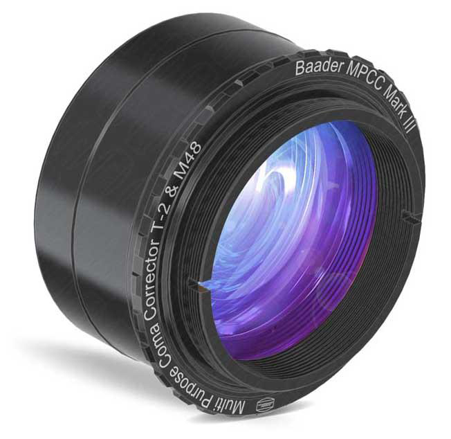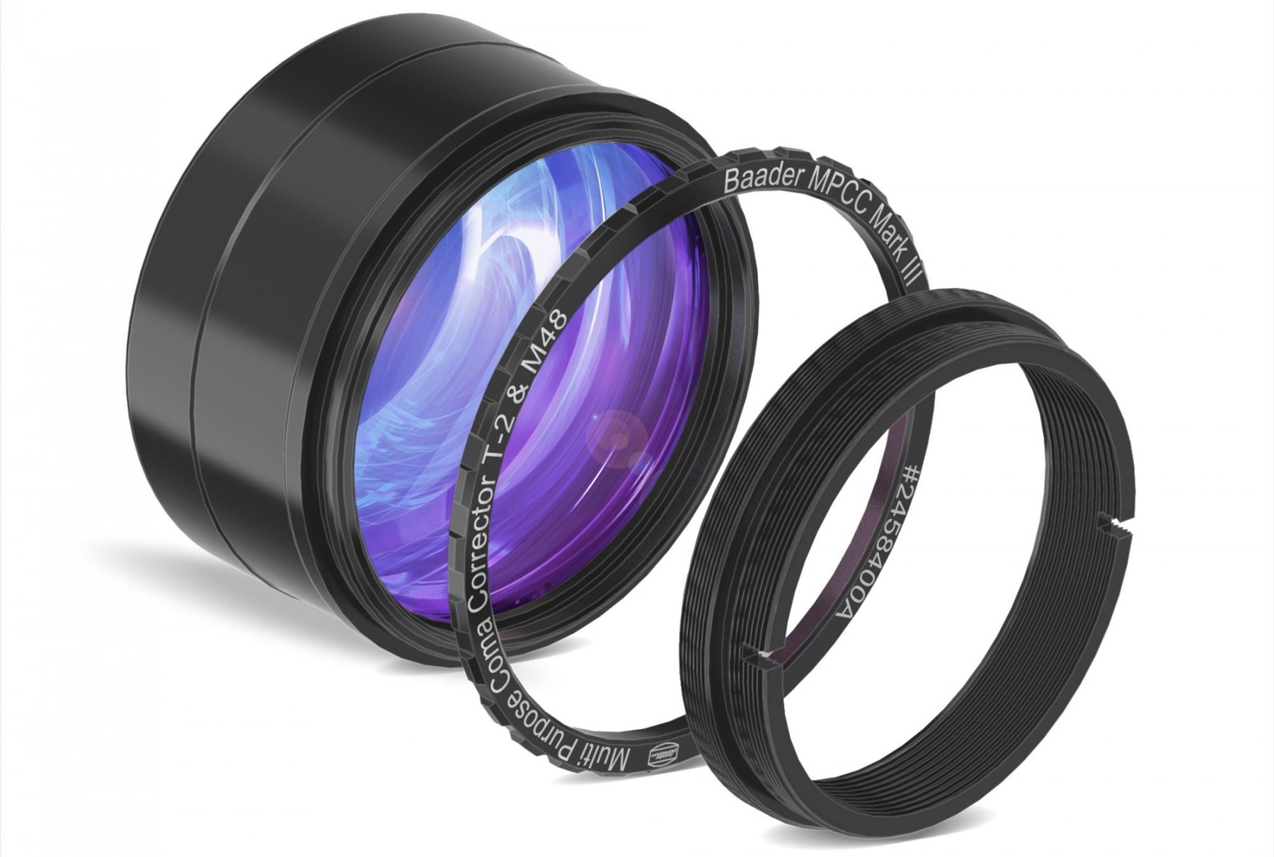 Der Multi Purpose Coma Corrector MARK III (MPCC III) eliminiert praktisch die gesamte Koma schneller Newton-Teleskope, ohne die Brennweite zu verändern. Die einzigartige Linsenanordnung ist auf allen Glas-/Luft-Flächen Phantom Coating™ Group multivergütet, dies bietet höchste Transmission über einen sehr breiten Spektralbereich von UV bis NIR. Der MPCC ist in der Mark III-Version an Spiegeln von f/3.5 bis f/6 hervorragend nutzbar und passt an praktisch alle 2" Okularauszüge und Off-Axis Guider. Sterne bleiben punktförmig über das ganze Gesichtsfeld, auch die berüchtigte Mittenunschärfe entfällt.