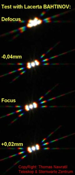 ACHTUNG: Nicht alle Fokussiermasken haben die gleiche Wirkung! Die zentrale Linie allein bestimmt die exakten Fokuslage nicht ganz genau! Nur dichte Gitter, verbunden mit extrem präziser Rand-Gestaltung ermöglichen die zusätzliche Aufspleißung der Sternabbildung, um die genaueste Ermittlung der Fokusebene zu ermöglichen.