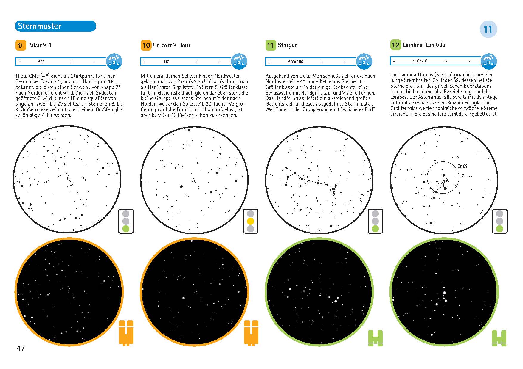 - Aufsuchkarten mit Gesichtsfeldern von 6° für Handferngläser und 3° für Großferngläser
