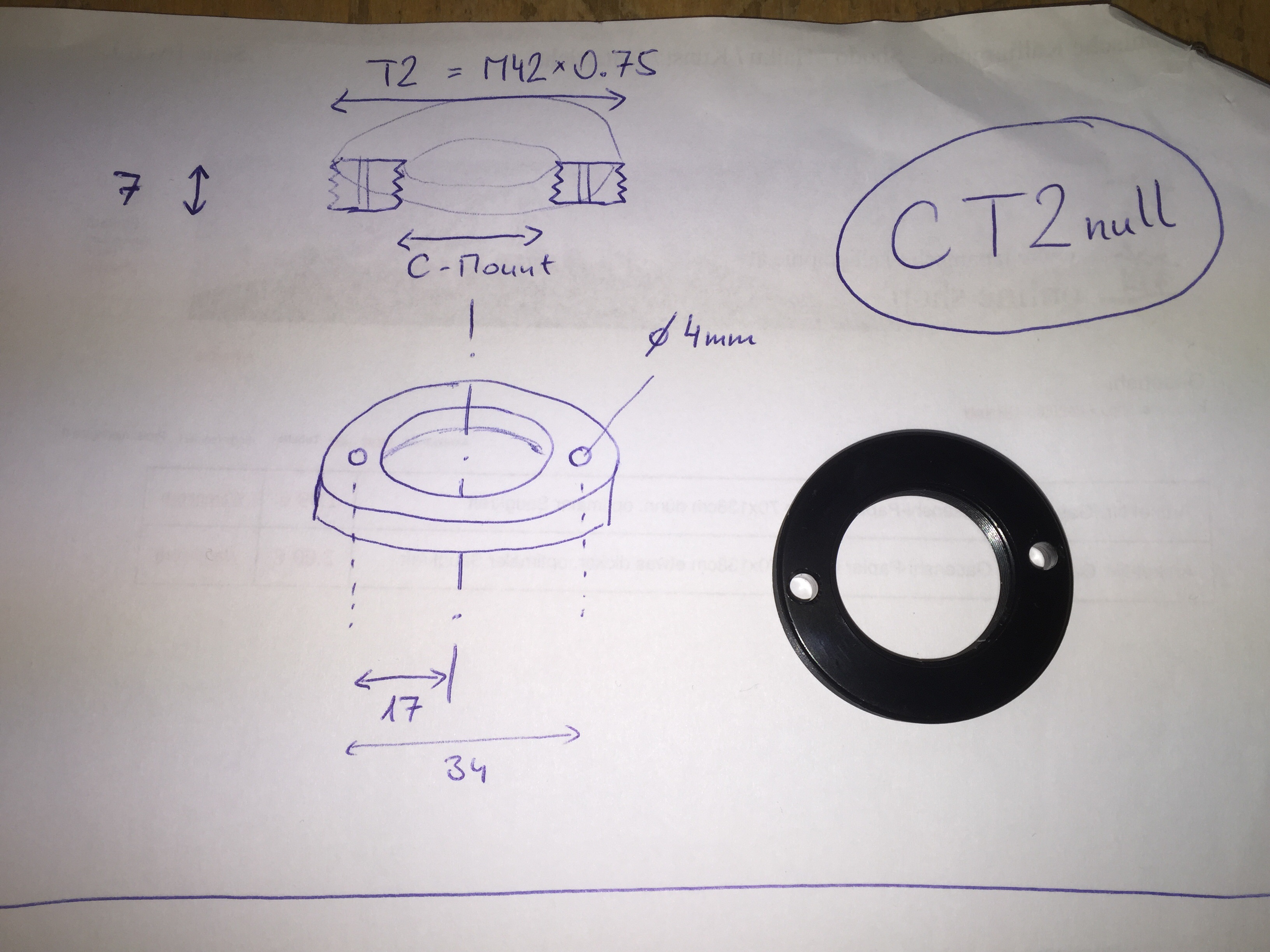 Adapter übersetzt von C-Mount auf T2-Außengewinde, das T2-Gewinde hat keinen Anschlag, der Lichtweg ist daher 0mm, vorausgesetzt er lässt sich im T2-Adapter ganz einschrauben. Er findet oft