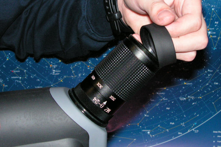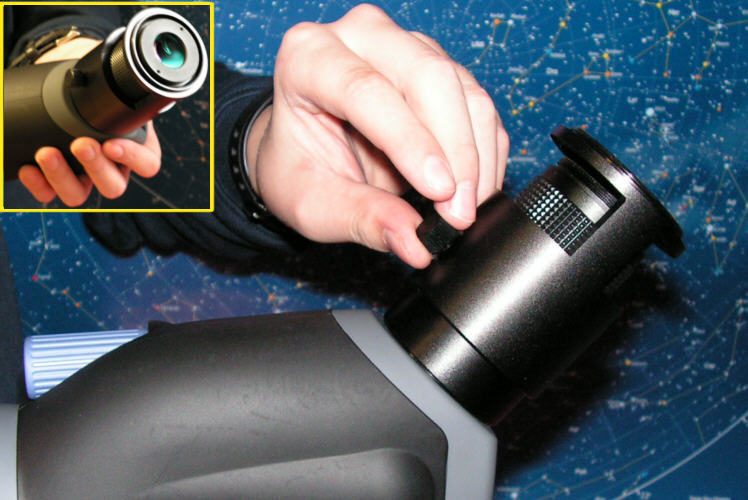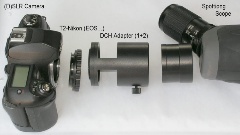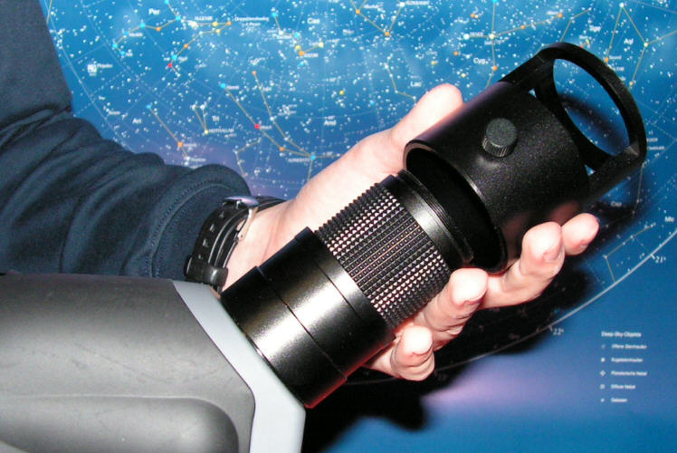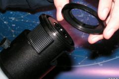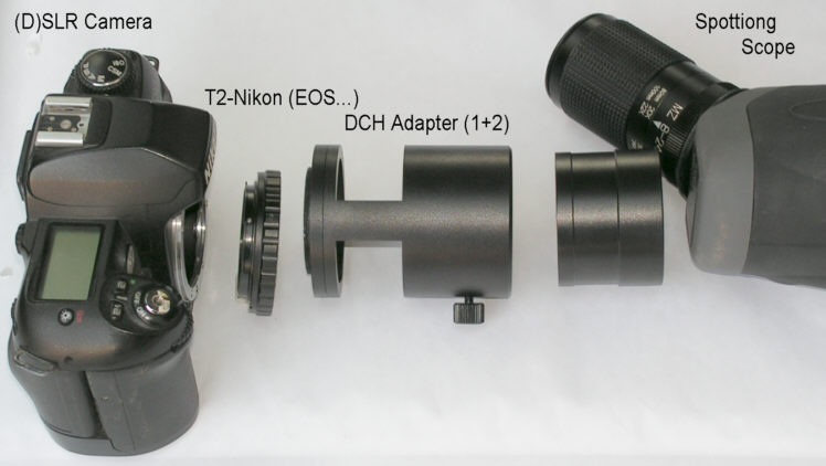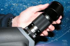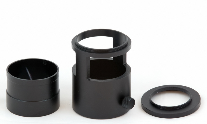 Kameraseitig besitzt er ein T2 Außengewinde, man benötigt lediglich noch einen T2 Bajonett-Ring um die (D)SLR zu befestigen. Der Adapter hat seitlich große Öffnungen, um bei angeschlossener Kamera die Vergrößerung und damit die Aufnahmebrennweite zu verändern.
