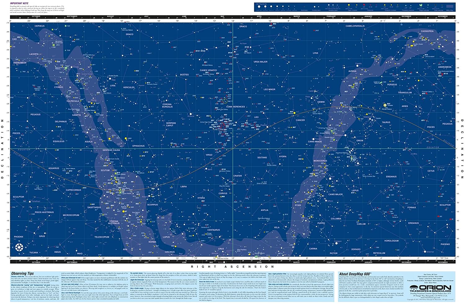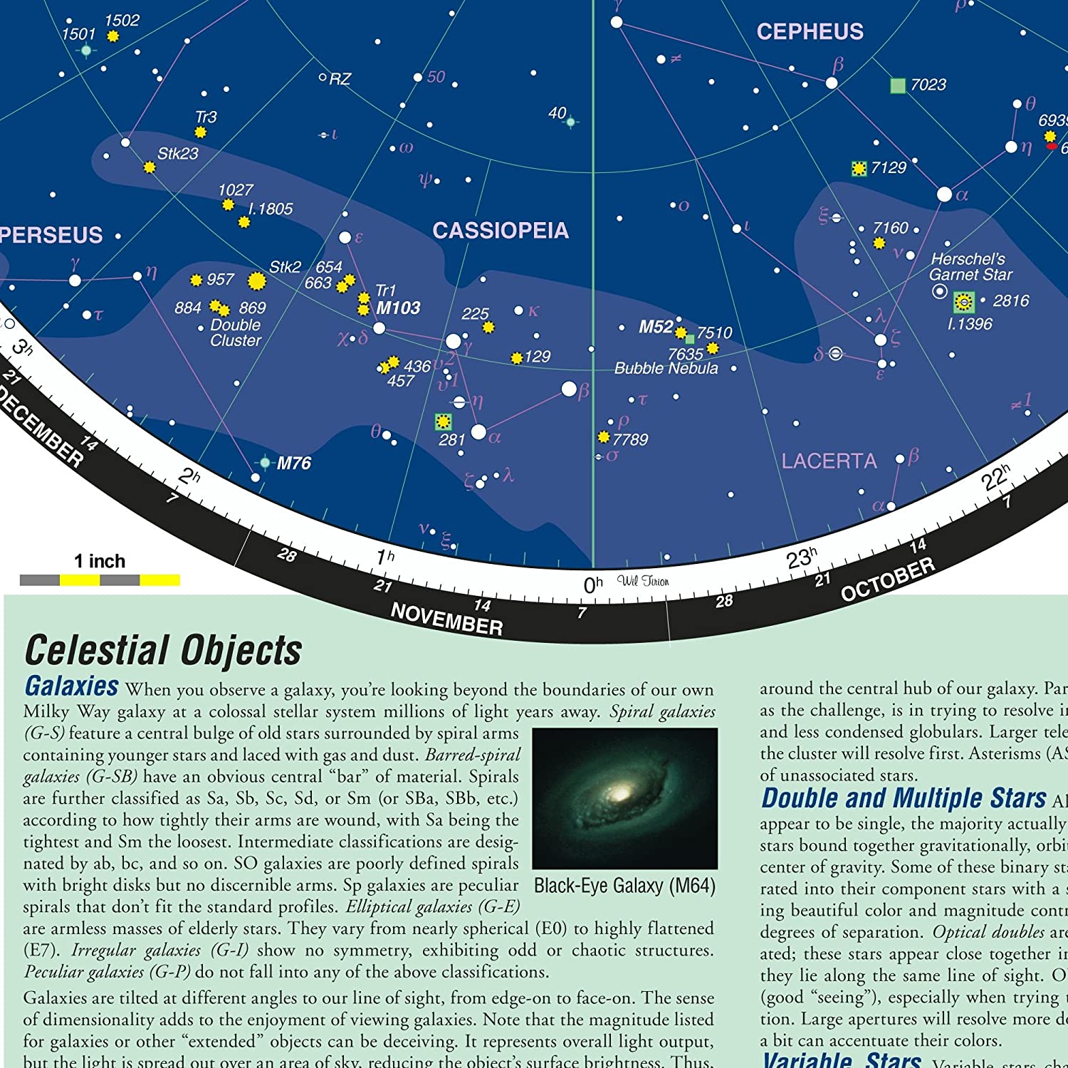 Diese einzigartige Karte wurde vom weltbekannten Himmels-Kartographen Wil Tirion entworfen und ist auf wasserabweisendem Papier gedruckt. Auf der Rückseite ist die nördliche Zirkumpolar-Region detailliert abgebildet, auch findet man hier Informationen der rund 600 DeepSky-Objekten, wie Koordinaten, Helligkeit oder Ausdehnung.