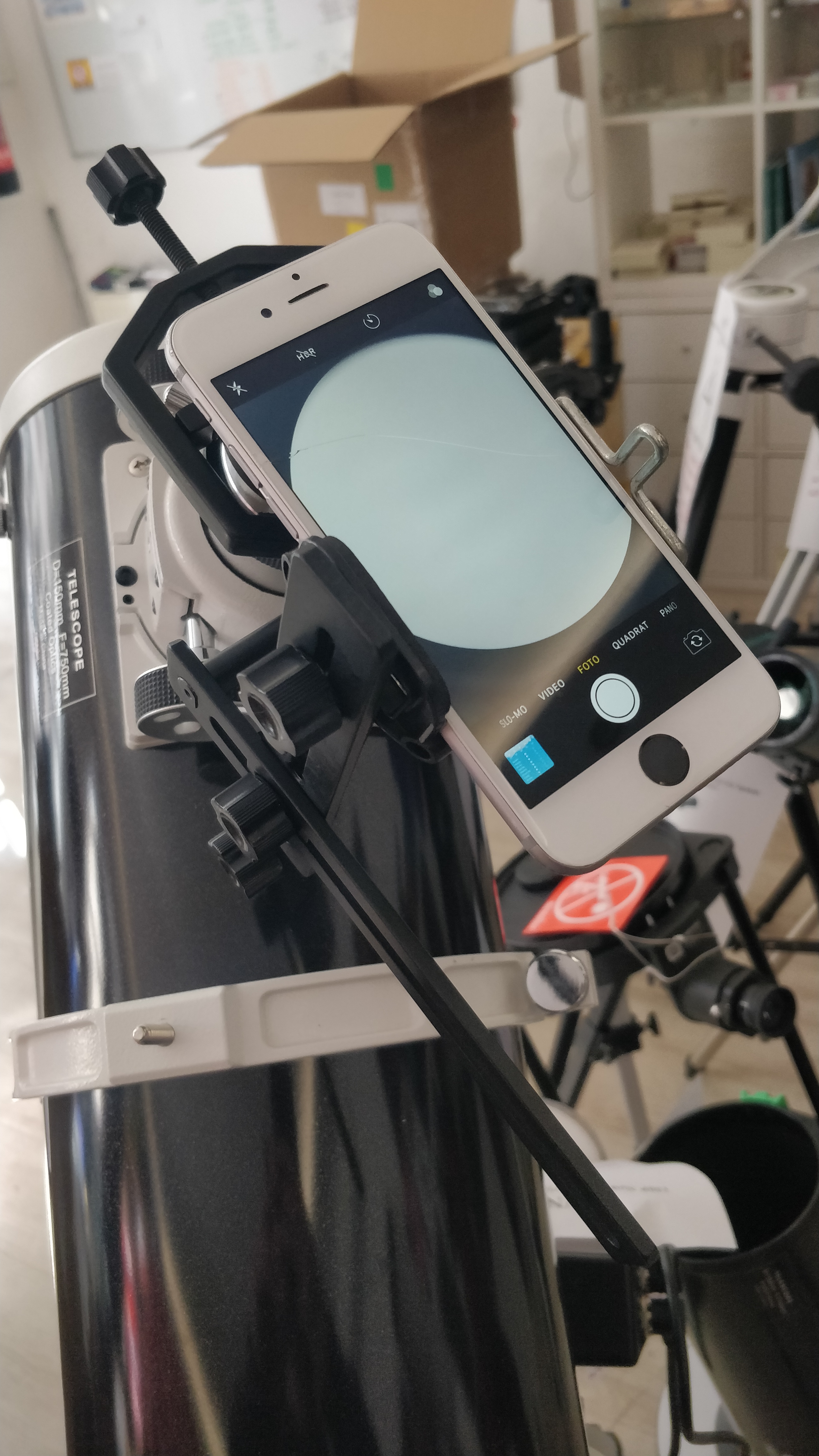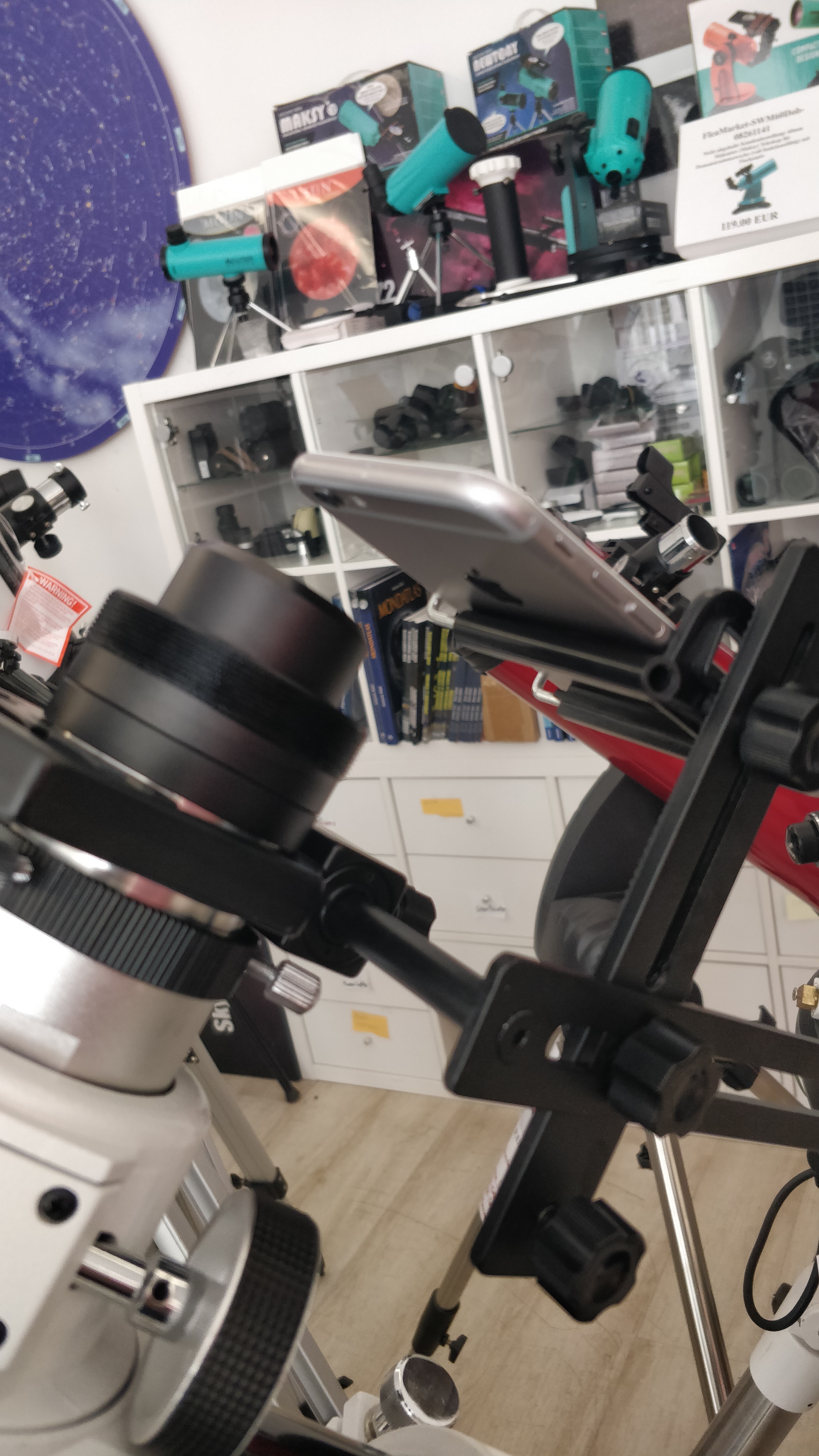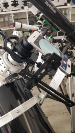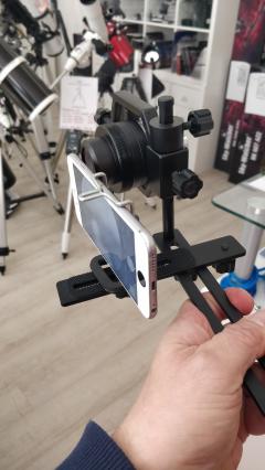 Kamera oder (durch Handyhalterung) des Mobiltelefons. Durch mehreren Gelenken werden Mobiltelefon bzw. Kamera und Okular (von Teleskop
