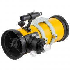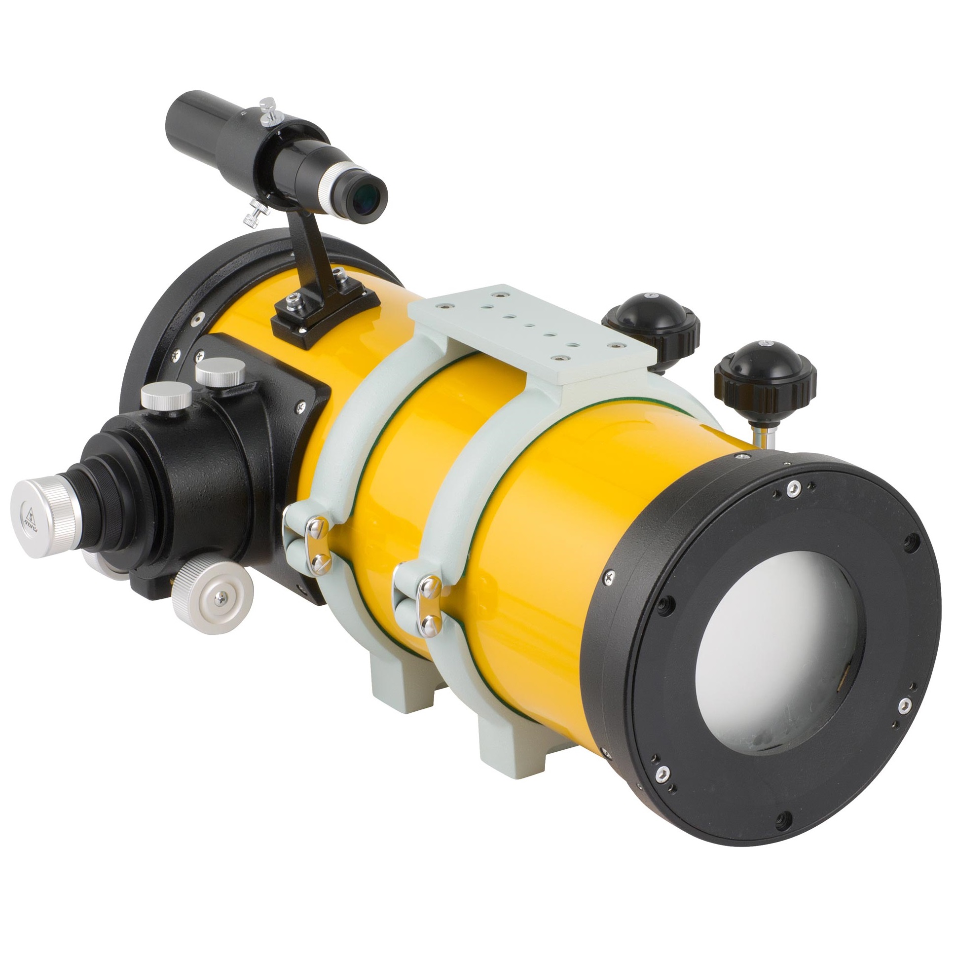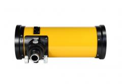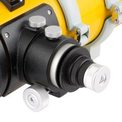 Der Okularauszug ist ein stabiler Zahn-/Trieb-Auszug, der an der Basis voll rotierbar ist und mit dem Mikrofokus MEF-3 nachgerüstet werden kann und soll, bei so lichtstarken Geräten ist natürlich eine genaue Fokussierung besonders wichtig, wir bieten aber auch einen passenden Adapter für unseren Lacerta MFOC-Motorfokus an. Der zweilinsige Korrektor ist im Okularauszug verschraubt, Adapter auf 1,25“ gehören zum Lieferumfang. Der Tubus ist extrem massiv, das Rohr besteht aus mehrere mm dicken Aluminium, die Schrauben hinten bei der Hauptspiegelzelle sind alle versenkt, der Tubus kann daher auch aufrecht abgestellt werden. Am Tubus ist eine Aufnahme für Sucherteleskope vorhanden, hier können die Takahashi 6x30 und 7x50 Sucher befestigt werden, mit der FindFFTKup Klemme können auch andere Sucher oder Guidescopes montiert werden.