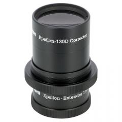 Takahashi ist es gelungen, für den Epsilon-130D einen Extender zu entwickeln, der die ausgezeichnete Sternabbildung auf der Achse wie im Feld beibehält. Die Brennweite wird um den Faktor 1.5x auf 650mm verlängert (f/5), daher ist der Epsilon auch für die Fotografie kleinerer Objekte geeignet, was das Einsatzspektrum deutlich erweitert. Es ist optisch ein hoher Bauaufwand erforderlich, der Extender ist mit 7 Linsen in 5 Gruppen aufgebaut. Er korrigiert mindestens so gut wie der originale 2-linsige Korrektor und erreicht Spot-Größen von nur 2 Mikrometer auf der Achse und maximal 8 Mikrometer in den Ecken vom Vollformat. Auch die Ausleuchtung ist mit 60% bei Vollformat erfreulich gut. Die Montage am Tubus ist denkbar einfach, der originale Korrektor wird einfach durch den Extender ersetzt. Mit diesem Extender ist der Epsilon auch besser für die Beobachtung einzusetzen, es wird daraus ein entspannter 1:5 Newton, was wesentlich weniger Anforderungen an die Okulare stellt.