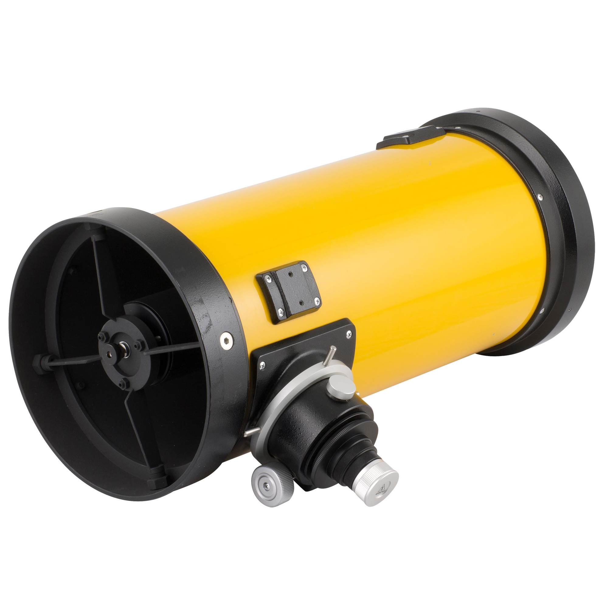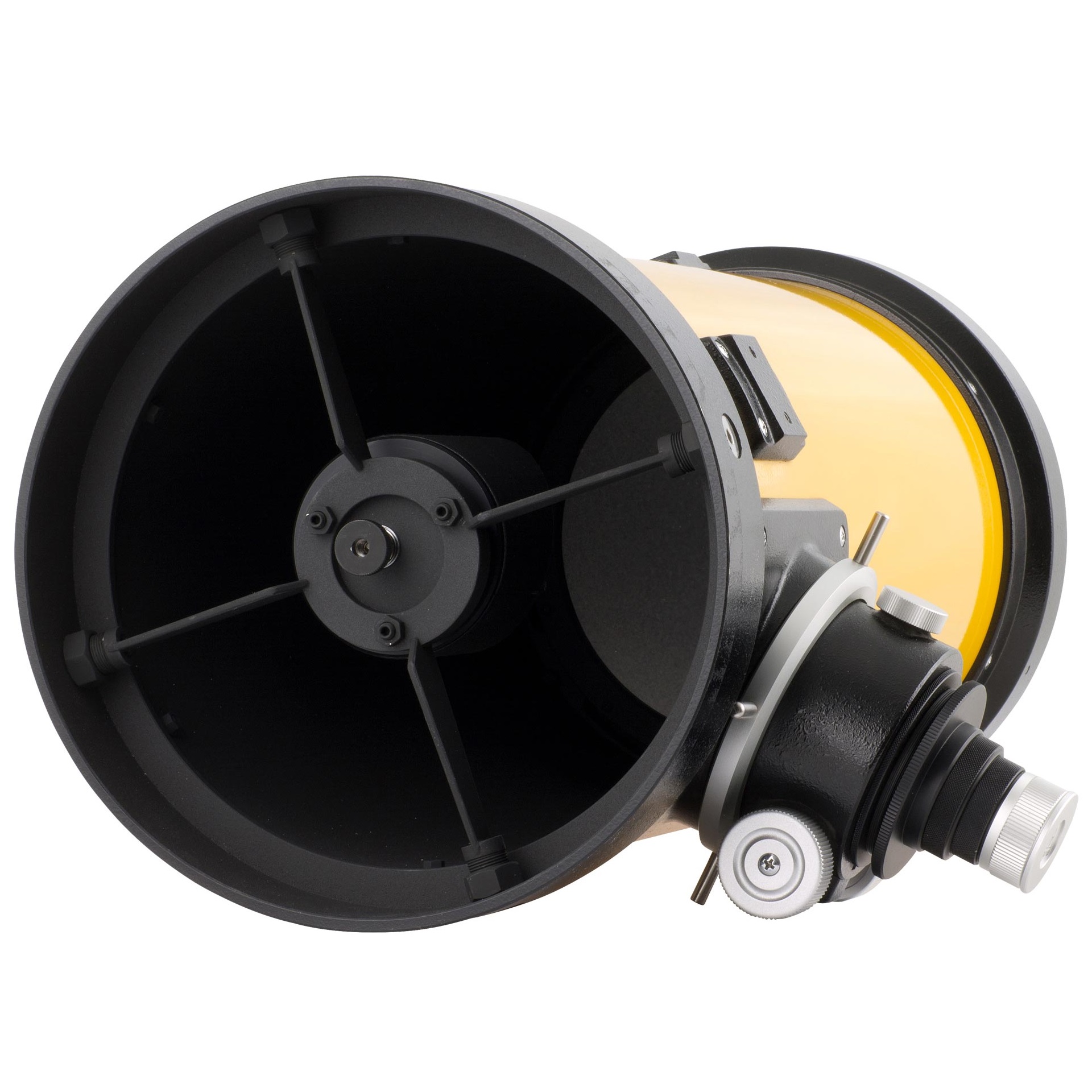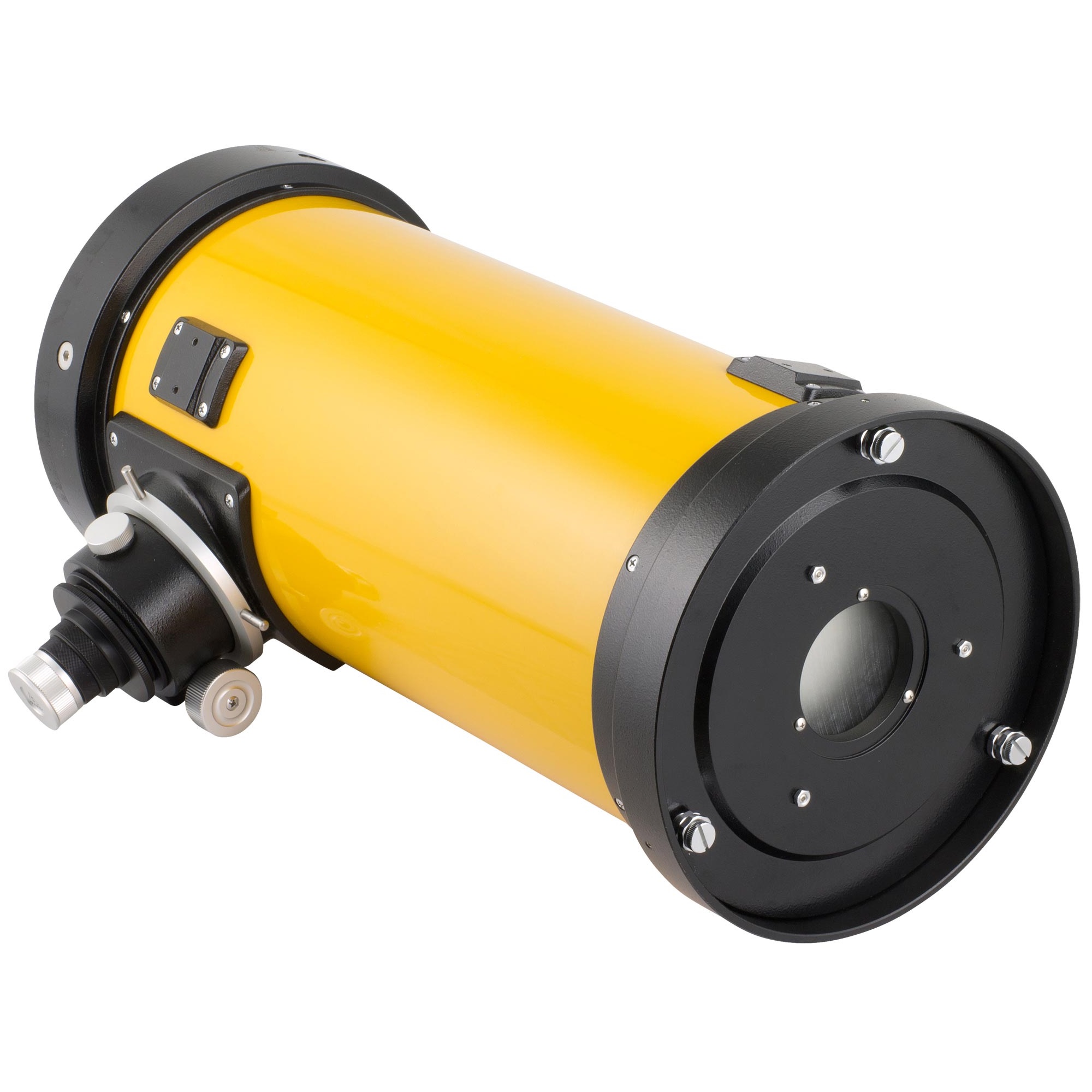 Der hyperbolische Hauptspiegel sitzt in einer massiven Fassung, er kann mit drei großen Sechskant-Schrauben justiert werden, man benötigt dazu einen 19mm Gabelschlüssel. Obwohl diese Geräte sehr lichtstark sind, muss man sie selten bis nie nachjustieren. Der Okularauszug ist ein stabiler Zahn-/Trieb-Auszug, der an der Basis rotierbar ist und dabei mit einem vollumfassenden Klemmring gehalten wird, das ist auch bei schwersten Zuladungen stabil. Der Auszug kann mit dem Mikrofokus MEF-3 nachgerüstet werden, das ist bei so lichtstarken Geräten absolut empfohlen, wir bieten aber auch einen passenden Adapter für unseren Lacerta MFOC-Motorfokus an. Der zweilinsige Korrektor ist im Okularauszug verschraubt, Adapter auf 1,25“ gehören zum Lieferumfang. Der Tubus ist extrem massiv, das Rohr besteht aus mehrere mm dicken Aluminium, hinten bei der Hauptspiegelzelle kann die zentrale Platte zur schnelleren Auskühlung des Spiegels entfernt werden, die Schrauben hinten sind alle versenkt, der Tubus kann daher auch aufrecht abgestellt werden. Am Tubus sind zwei Aufnahmen für Sucherteleskope vorhanden (eine vorne beim OAZ, eine auf der gegenüberliegenden Seite hinten beim Hauptspiegel), hier können die Takahashi 6x30 und 7x50 Sucher befestigt werden, mit der FindFFTKup Klemme können auch andere Sucher oder Guidescopes montiert werden.