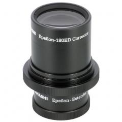 Takahashi ist es gelungen, für den Epsilon-180D einen Extender zu entwickeln, der die ausgezeichnete Sternabbildung auf der Achse wie im Feld beibehält. Die Brennweite wird um den Faktor 1.5x auf 770mm verlängert (f/4.3), daher ist der Epsilon auch für die Fotografie kleinerer Objekte geeignet, was das Einsatzspektrum deutlich erweitert. Es ist optisch ein hoher Bauaufwand erforderlich, der Extender ist mit 7 Linsen in 5 Gruppen aufgebaut. Er korrigiert mindestens so gut wie der originale 2-linsige Korrektor und erreicht Spot-Größen von nur 2 Mikrometer auf der Achse und maximal 5 Mikrometer in den Ecken vom Vollformat. Auch die Ausleuchtung ist mit 60% bei Vollformat erfreulich gut. Die Montage am Tubus ist denkbar einfach, der originale Korrektor wird einfach durch den Extender ersetzt. Mit diesem Extender ist der Epsilon auch besser für die Beobachtung einzusetzen, es wird daraus ein entspannter 1:4,3 Newton, was weniger Anforderungen an die Okulare stellt.