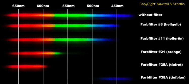 Hellrot: ab 60mm, für sehr hohen Kontrast am Mond - auch bei kleinen Öffnungen. Für die Beobachtung der Polkappen des Mars (ab 100mm Öffnung).