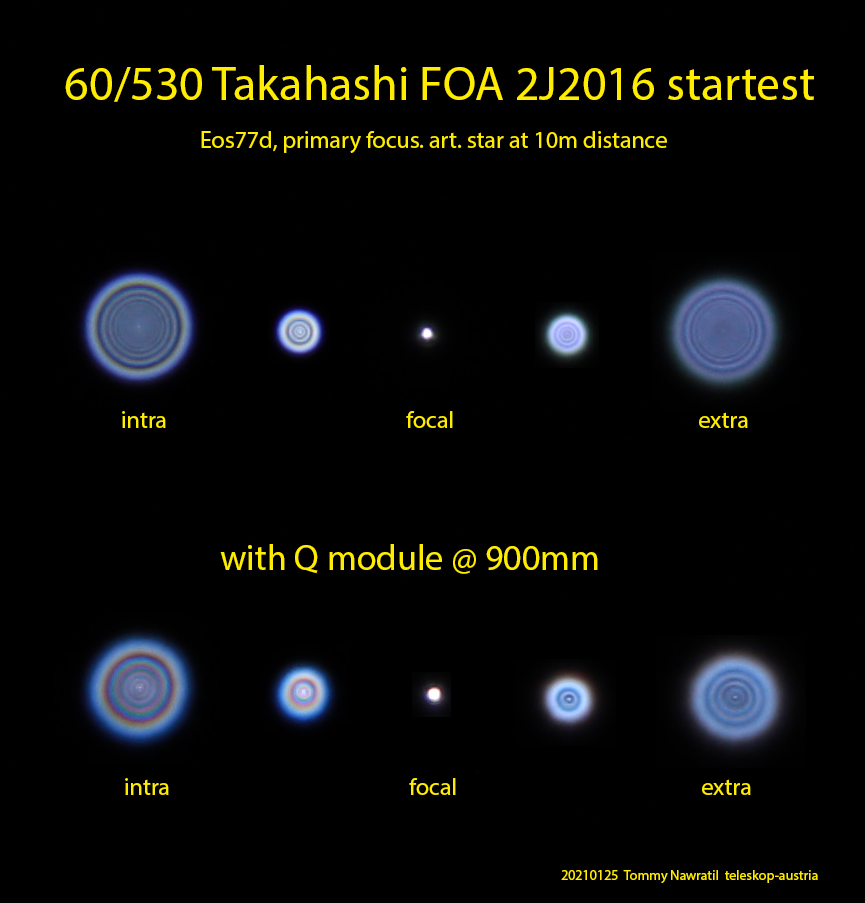 Die neue Optik mit 60mm Öffnung und 530mm Brennweite (f/8,8) kann mit einem Q-Modul mit 1,7-fachen Verlängerungsfaktor zu einem 60/900 (f/15) Refraktor aufgerüstet werden, er ist aber werkseitig auch komplett als FOA-60Q erhältlich. Dieser Extender mit vier Linsen in zwei Gruppen wird zwischen Tubus und Okularauszug geschraubt, dieses Prinzip ist schon vom FS-60Q bekannt. Er ist jedoch nicht als einfache Barlow zu verstehen, zusätzlich zur Brennweitenverlängerung korrigiert er auch die sphärische Aberration und ebnet das Bildfeld. Dieses Gerät besitzt die beste Korrektur aller Takahashi Teleskope und erreicht einen maximalen Strehl von 99.8% und 99% über das gesamte visuelle Spektrum! Selbst bei 300-facher Vergrößerung liefert diese kleine Optik noch ein klares Bild.