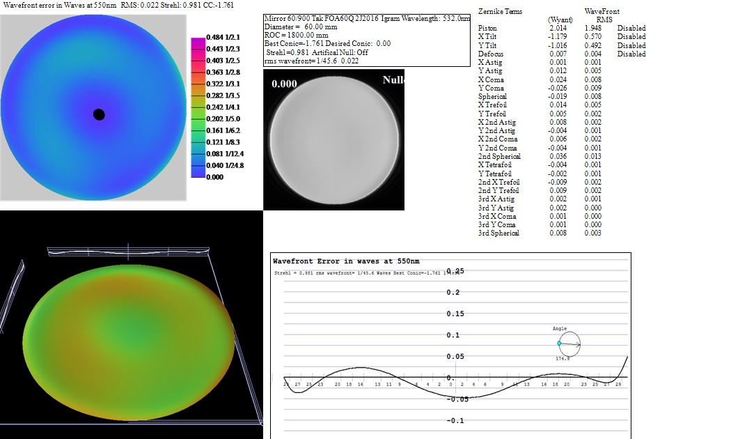 Die neue Optik mit 60mm Öffnung und 530mm Brennweite (f/8,8) ist hiermit werkseitig auch komplett als FOA-60Q mit dem neuen 1,7x Extender als 60/900 (f/15) Refraktor erhältlich. Dieser Extender mit vier Linsen in zwei Gruppen ist zwischen Tubus und Okularauszug geschraubt, dieses Prinzip ist schon vom FS-60Q bekannt. Er ist jedoch nicht als einfache Barlow zu verstehen, zusätzlich zur Brennweitenverlängerung korrigiert er auch die sphärische Aberration und ebnet das Bildfeld. Dieses Gerät besitzt die beste Korrektur aller Takahashi Teleskope und erreicht einen maximalen Strehl von 99.8% und 99% über das gesamte visuelle Spektrum! Selbst bei 300-facher Vergrößerung liefert diese kleine Optik noch ein klares Bild.