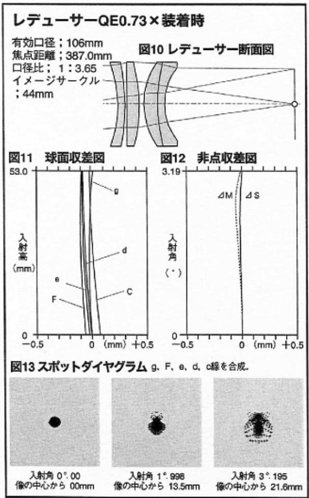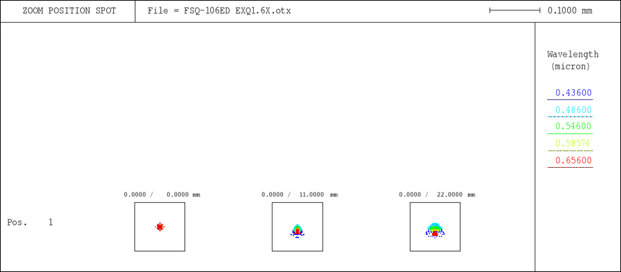 fest im Tubus verbaut und in 4 Gruppen angeordnet, bei 2 Linsen wird ein ED-Glas verwendet. Im Vergleich zum alten FSQ-106 Fluorit, konnte die chromatische Aberration nochmals reduziert werden. Auch die Sphärochromasie ist deutlich besser, er arbeitet wie auch die "langsameren" TOA-Objektive vom nahen Ultraviolett-Bereich bis ins Infrarote bei zirka 1000nm absolut zufriedenstellend. Diese höhere Korrektur wurde neben der Verwendung von den besten ED-Gläsern, unter anderem dadurch erreicht, dass die dritte Linse nun näher beim Objektiv liegt und so ein höheres Maß an Korrektur möglich ist. Sie ist 50% größer als beim Vorgänger und ermöglicht auch eine bessere Ausleuchtung.