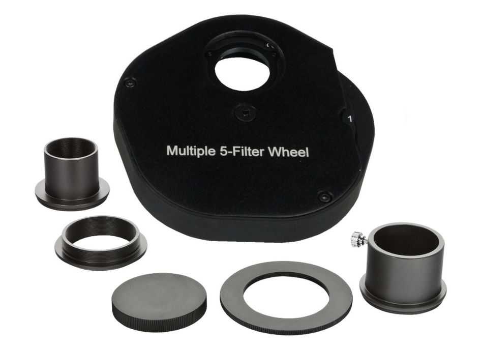 Zum Lieferumfang gehören mehrere Adapter, somit kann das Filterrad optimal adaptiert und auch fotografisch verwendet werden. Ein Adapter mit 1,25" Hülse und T2-Außengewinde ermöglicht den Anschluss an Teleskope ohne T2-Gewinde. Der Adapter was beidseitig ein T2-Außengewinde hat, dient zum Anschluss einer Kamera oder anderes Zubehörs mit T2-Gewinde, ein Konterring ermöglicht auch noch die Fixierung in einer bestimmten Position. Ebenfalls enthalten ist ein Okularadapter mit T2-Außengewinde zur Klemmung von 1,25" Okularen. Eine hochwertige T2-Staubkappe aus Metall schützt die Filter im Rad vor dem Verstauben.