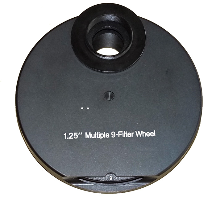 Dieses äußerst hochwertig und komplett aus Metall verarbeitete Filterrad besitzt Schraubplätze für 9 Standard 1,25" Filter, das Filterrad lässt sich leicht bewegen und rastet satt und ohne Spiel in seinen Positionen ein. Die Filter lassen sich von aussen einschrauben sodass man das Filterrad nicht öffnen muss. Es hat beidseitig ein T2-Innengewinde, ein Adapter auf 1,25" Steck für die Montage am Fernrohr ist enthalten. Kameraseitig ist ein Adapter mit beidseitigem T2-Außengewinde enthalten, dieses ist auf einer Seite deutlich länger und mit einem Konterring versehen, hier kann z.B. ein Bajonett-Ring oder eine Klemme für 1,25" Zubehör montiert werden.