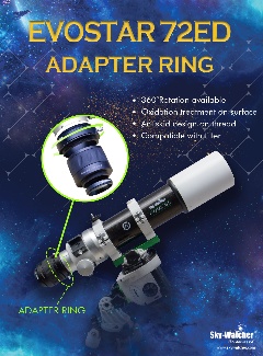SkyWatcher Rotationsadapter für den 72/420 Black Diamond Apo und den dazu passenden 0,85x Reducer/Korrektor. Er ermöglicht das einfache Drehen der Kamera samt Reducer, somit kann der Bildausschnitt leicht an das Himmelsobjekt angepasst werden, geklemmt wird mit drei Rändelschrauben auf einen Konus.