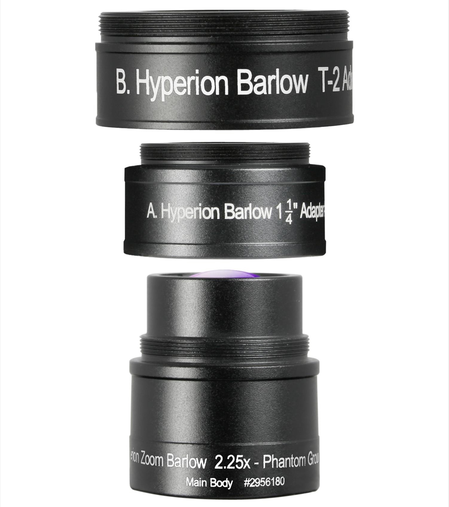 Die Hyperion Barlow ist durch den T2 Adapter, der im Lieferumfang enthalten ist, an jede DSLR Kamera oder CCD Kamera adaptierbar. Die optische Leistung entspricht der eines ausgezeichneten Konverters. Vor allem die Feldschärfe wird aufrecht erhalten.
