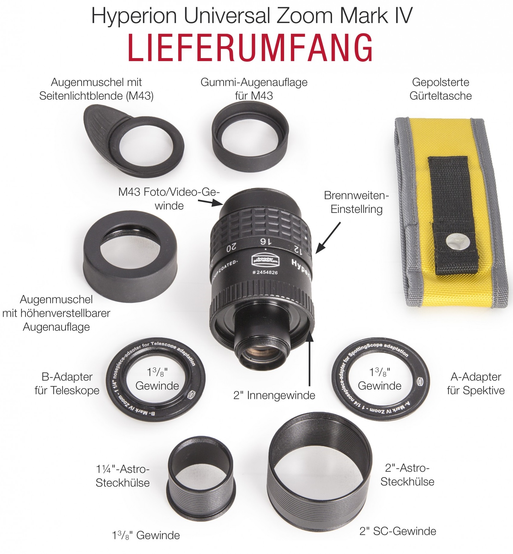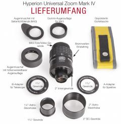 Das Hyperion Universal Zoom Mark IV wird geliefert mit zwei austauschbaren Steckhülsen (1¼" und 2"), sowie einem 2" SC-Innengewinde zum direkten Anschluss an Teleskope bzw. an Spiegel / Prismen mittels des optionalen 2"i auf 2"a Umkehrrings (#1508080).