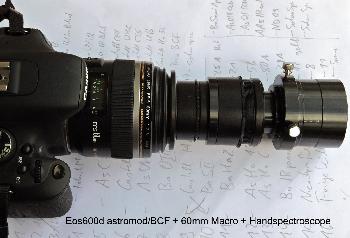 Der T2 Adapter wird dann mit geeigneten Adaptern (hier variable M48 und T2 Adapter) an das Gewinde eines Fotoobjektives (hier ein 60mm Makro) verschraubt, so dass das Spektrum eine vernünftige Größe am Bild bekommt.