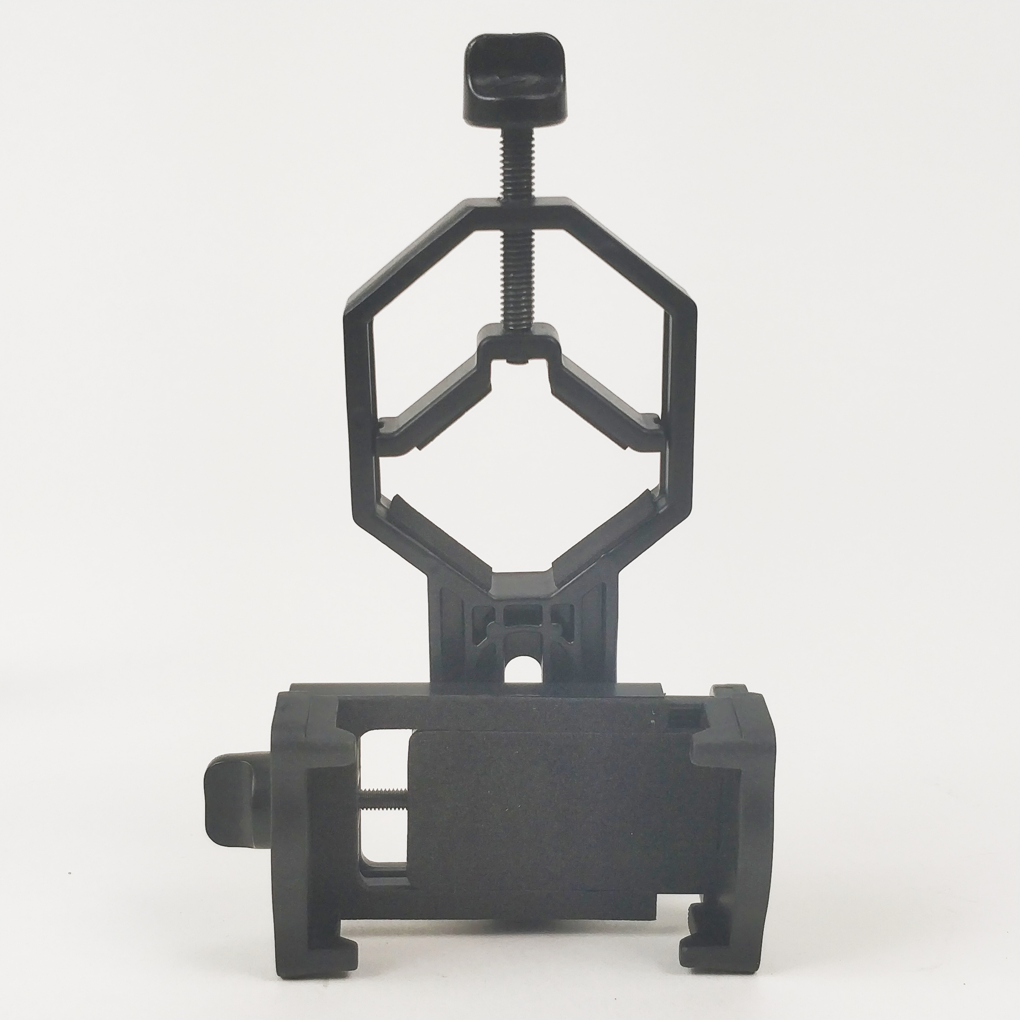 Das Handy selbst kann in einer gummierten Klemme befestigt werden, die das Smartphone schonend, aber sicher hält. Die Positionen von seitlichen Knöpfe ist ausgespart - bei richtiger Position kann kein versehentliches Abschalten passieren. Sowohl Drehwinkel als auch Höhe kann mit einem einzigem Schraube eingestellt werden, damit die Handykamera dann auch wirklich zentrisch in die Optik sieht. Diese Metallklemme kann auch abmontiert und separat verwendet werden, sie besitzt dazu eine 1/4" Innengewinde für Fotoköpfe.