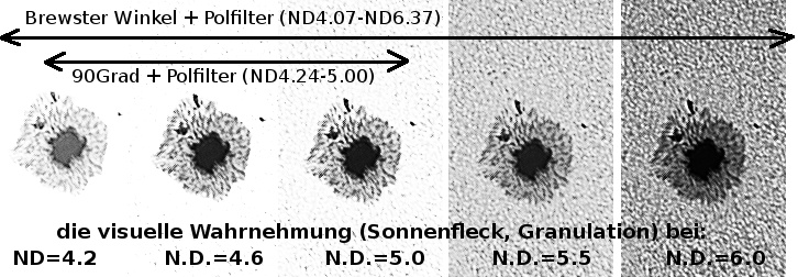 Die visuelle Wahrnehmung bei verschiedenen Neutralen Dichten zeigt das Bild unten. Es ist gut zu sehen, dass die Granulation bei traditionellen Herschel Prismen nur mit einem zusätzlichen DRITTEN Filter (ND3 und Polfilter sind vorausgesetzt!) gut beobachtbar ist. Herschel Prismen mit Brewster Winkel brauchen keinen zusätzlichen Filter, weil der Dimmbereich hier kontinuierlich bis ND6.37 möglich ist!
