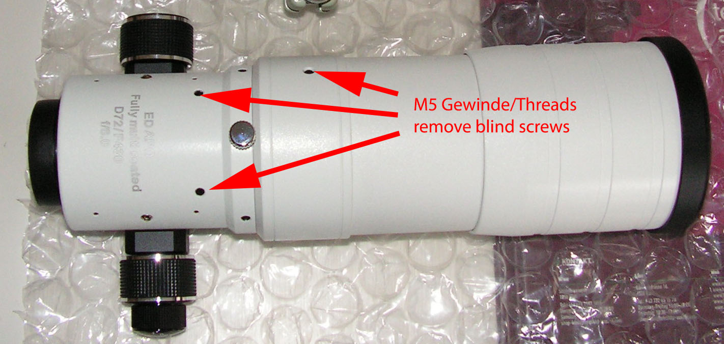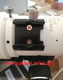Der "Fuß" des Lacerta 72/432 ist mit 2x M6 Schrauben an der Unterseite befestigt. Sie können den Fuß abschrauben und umdrehen, um bessere Balance zu ermöglichen. Zum Klemmen an einer Montierung drehen Sie den Fuß um und verdrehen den Okularauszug so, dass die Fokussiereinheit links oben und der SucherSchuh mit Guidescope rechts oben positioniert sind. Mit einem Rotator des Flatteners können Sie den Bildausschnitt an der Kamera rotieren und einstellen.