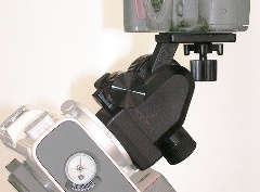 Funktionsweise: Der Getriebeneiger ist eine einfache Konstruktion (sog. Tangentialarm), eine Schnecke läuft dabei in einer Überwurfmutter und verschiebt diese hin und her. Ein gewisses Spiel ist dabei konstruktionsbedingt unvermeidlich, sonst würde sich gar nichts bewegen lassen. Normalerweise hat die Kamera samt Tele genug Ungleichgewicht, um das Spiel nicht zum tragen kommen zu lassen. Die Überwurfmutter wird immer auf eine Seite der Schneckenflanke gezogen. Bei Leichtgewichten ist es aber gut wenn der Fotograf darüber Bescheid weiss, und am Anfang der Belichtung durch einen kurzen Druck in die richtige Richtung nachhilft, damit dann nichts mehr von selbst nachrücken kann.