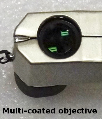 Das optische Design dieser Operngläser ist nicht das gewöhnliche Galilei-Design, sondern eine miniaturisierte Variante von Jagdferngläsern. Die Ferngläser - pardon, Operngläser- wurden jedoch so weit verkleinert, wie es nur möglich war. Das Resultat: ein überraschend leichtes Opernglas (es wiegt nur ca. 80 gramm!) mit echtem Glasprisma und achromatischen Glaslinsen, welche alle voll vergütet sind (siehe Foto oben, mit der grünen Antireflexionsbeschichtung).