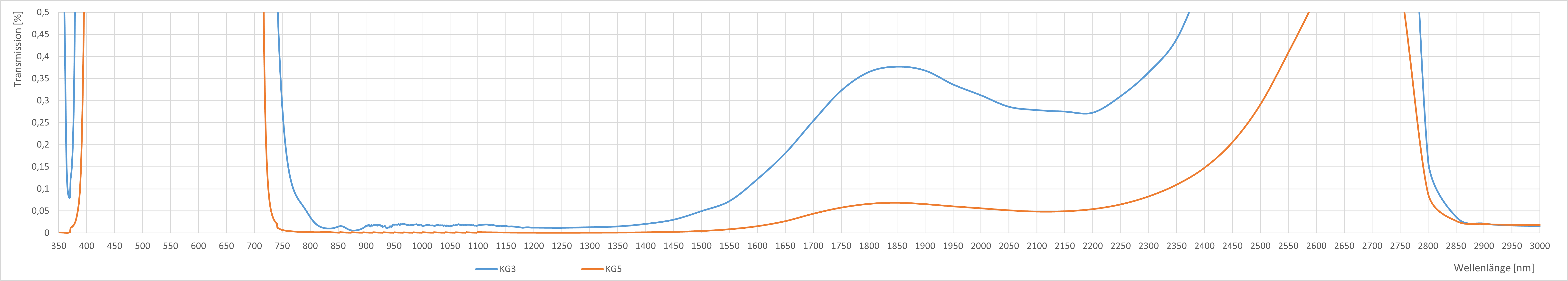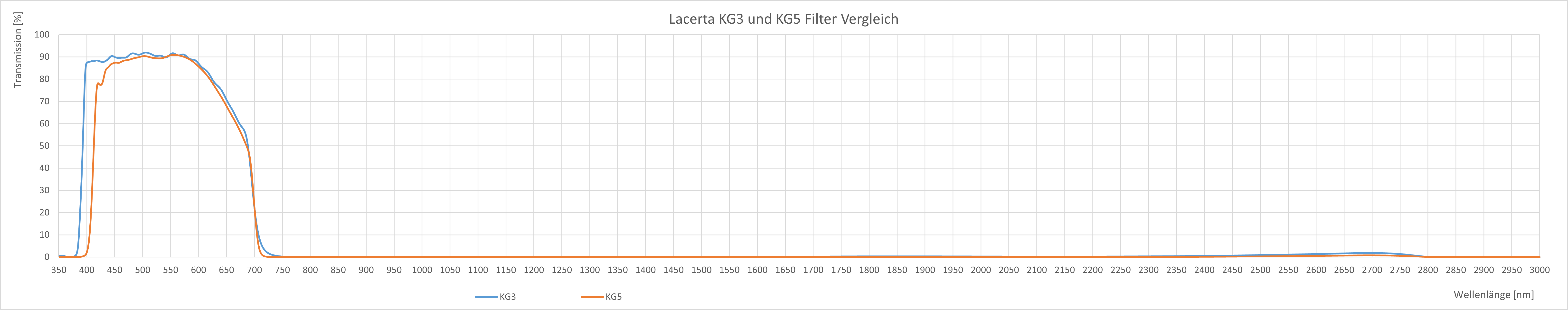 Der LacertaKG3 Filter hat eine Transmission von weniger als 0,05 % zwischen 800 nm und 1500 nm. Der neue KG5-Filter hingegen erreicht eine Transmission von 0,001 % in einem viel breiteren Bereich zwischen 760 nm und 2200 nm. Somit dämpft der KG5 im Vergleich zum KG3 etwa 50-mal besser und der Bereich ist etwa doppelt so groß (700 nm im Vergleich zu 1440 nm). Auch im UV-Bereich beginnt der KG5-Filter früher zu dämpfen. (T<0,5 % unter etwa 400 nm)