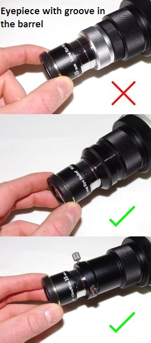 Dank des breiten Führungsrings ist es auch völlig egal, ob das Okular eine Sicherungsnut gegen Herausfallen besitzt oder nicht. Die zylindrische Führungsfläche hält das Okular von der obersten Stelle der Auflage bis ca. zur Mitte sicher fest. Sie kann die Takahashi Okularklemme TKP00101 ersetzen, diese besitzt einen schmaleren Klemmring, dadurch kann es bei Okularen mit Sicherungsnut zu Verkippungen kommen.