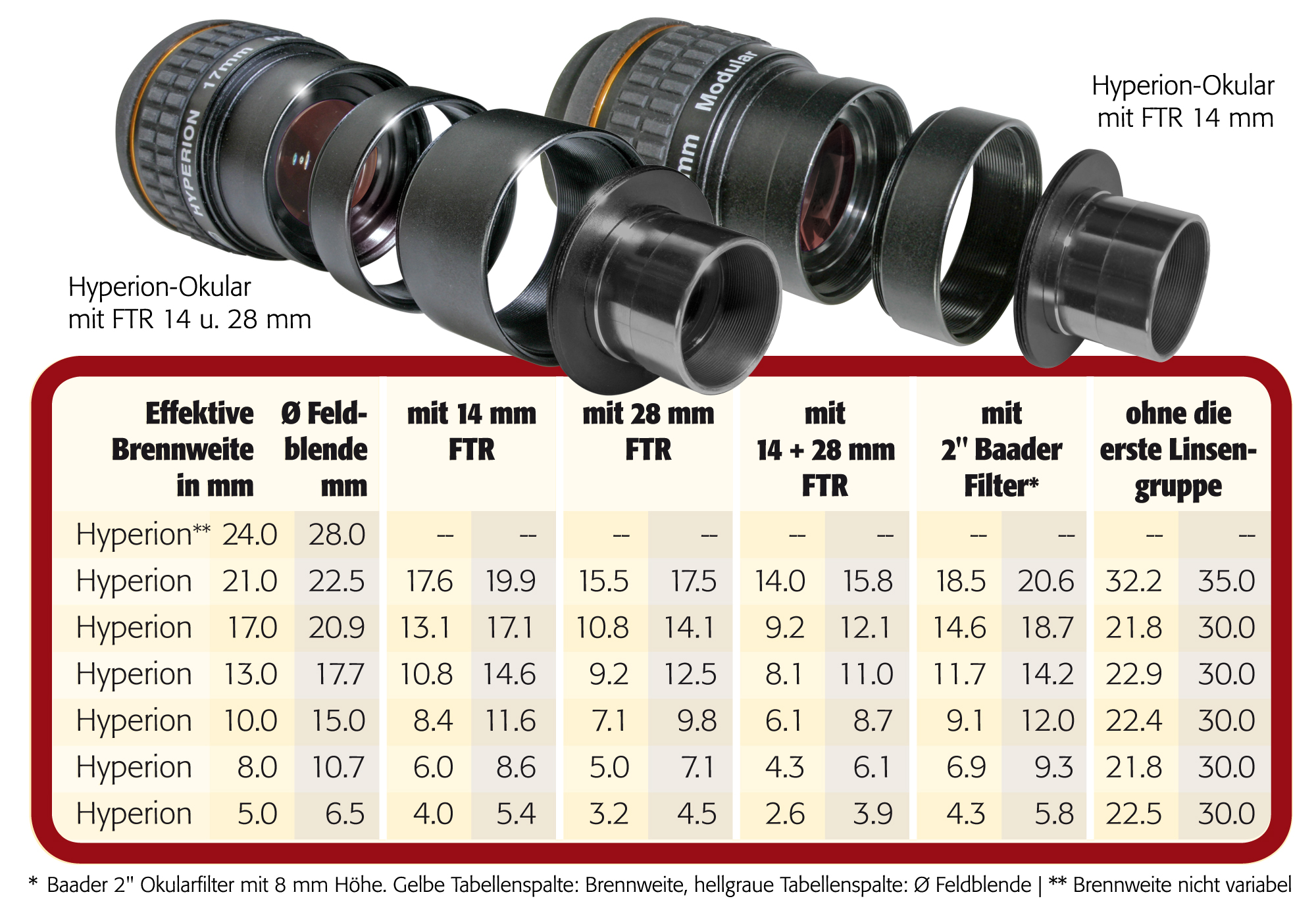 Mit unseren 2" Feintunings-Verlängerungsringen 14 und 28 mm oder sogar mit unseren 2" Baader Okularfiltern können Sie zu sehr moderaten Preisen eine Vielzahl zusätzlicher Hyperion-Okularbrennweiten selbst zusammenstellen. Ohne Verlust an Schärfe lässt sich ein 5 mm Okular in die Brennweite von 2,6 verwandeln – vor allem, weil keine zusätzlichen Linsen in den Strahlengang eingebracht werden, wie es bei einer zusätzlichen Barlowlinse unumgänglich wäre.