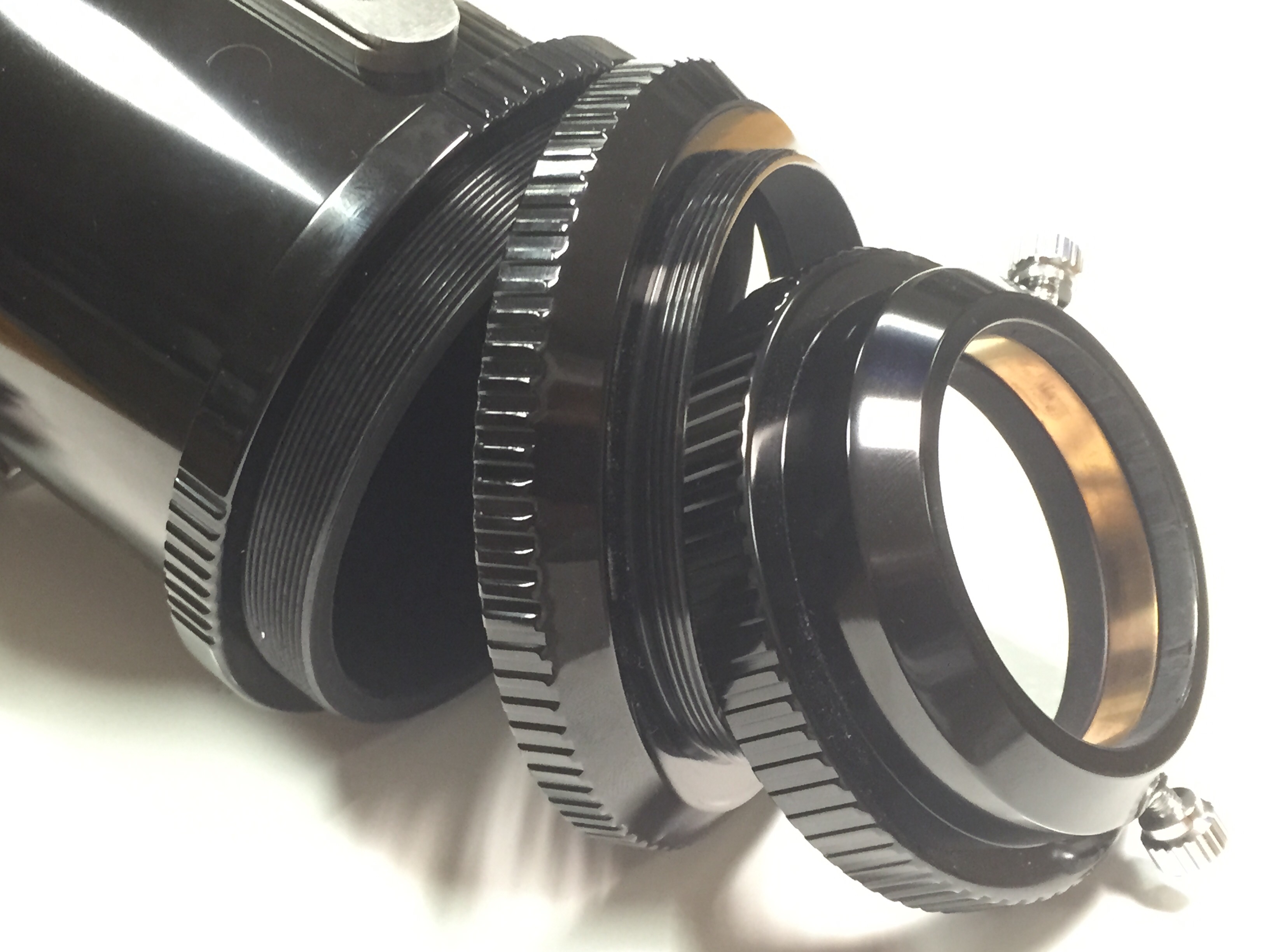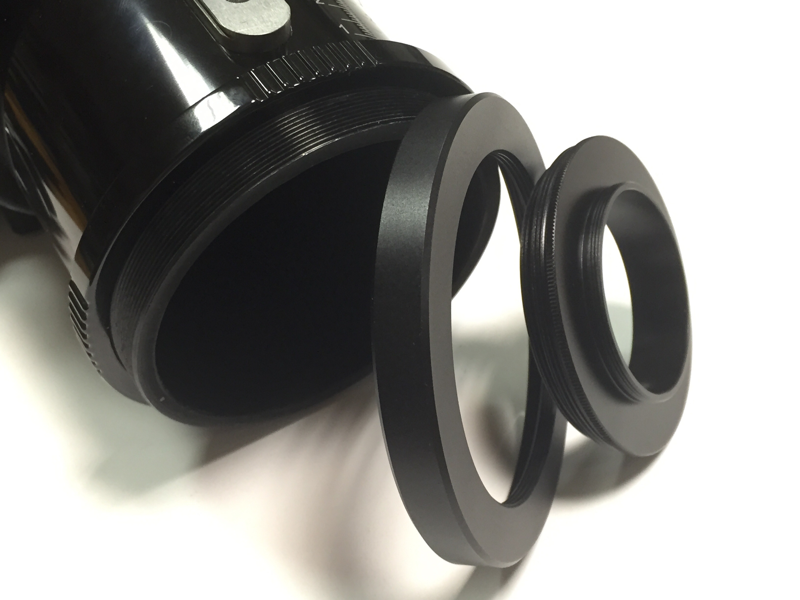 Dieser Adapter ermöglicht M68-Zubehör in ESPRIT-Auszüge mit M86 Gewinde (Esprit100, Esprit-120 und Esprit150) von INNEN zu befestigen. Als ersten Schritt schrauben Sie das M68 Zubehör in den M68M86n Adapter rein. Das kann man von beiden Seiten tun, abhängig vom Verwendungszweck (z.B. Optik oder weitere Adapter). Falls das M68-Zubehör nicht zu breit ist, kann die bereits zusammengeschraubte Einheit vollständig in den Okularauszug versenkt werden, ohne Lichtwegverlust. Wird oft mit dem Adapter "M68M63M48p" zusammen gekauft (siehe Foto unten), um den Riccardi Reducer im Okularauszug verkippungsfrei versenken zu können.