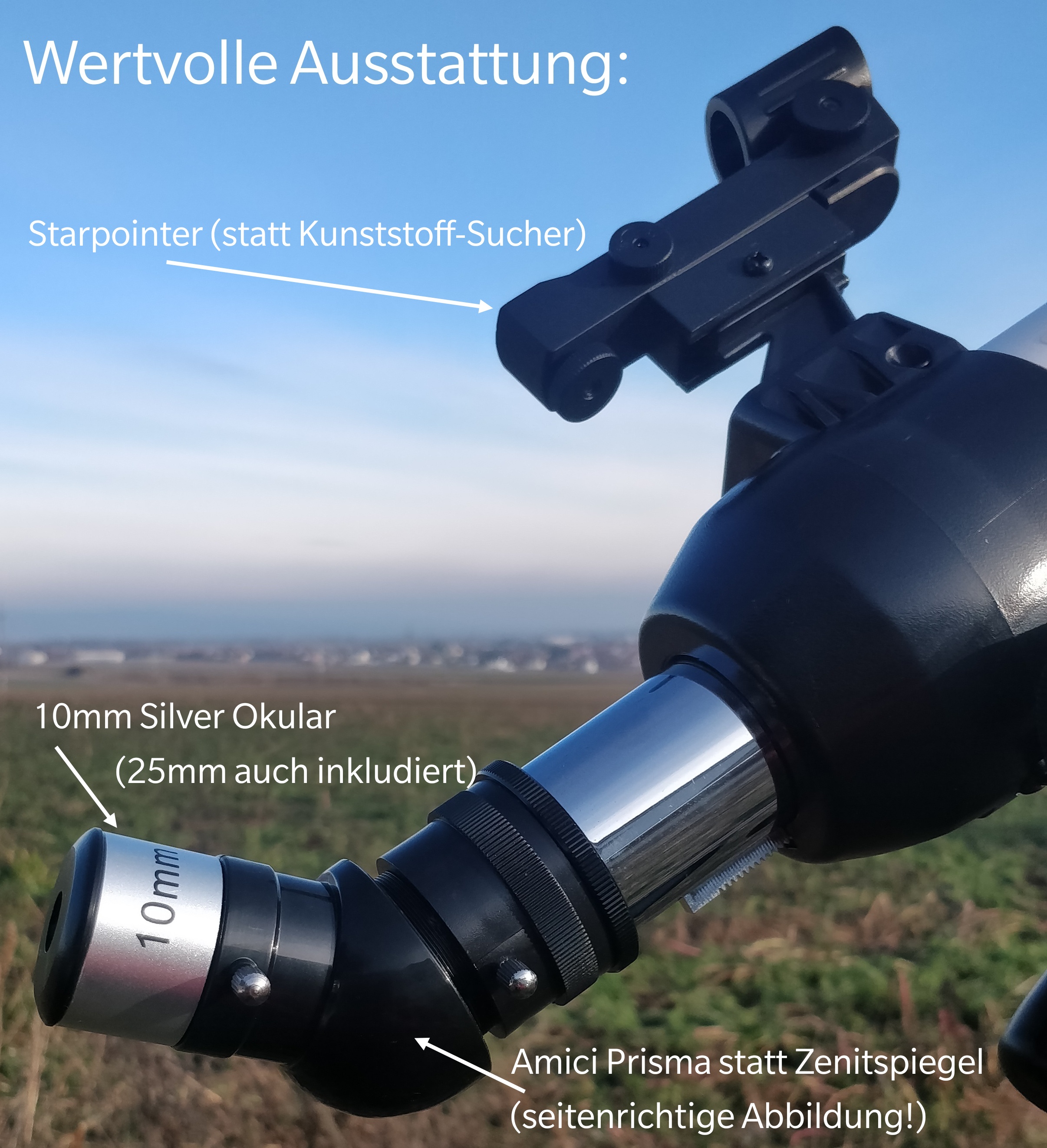 Aber das Gerät kann noch mehr! Dank des mitgelieferten Amiciprismas (statt dem gewöhnlichem Zenitspiegel) ist die Abbildung aufrechtsstehend und seitenrichtig. Es steht nichts in Wege, das Teleskop auch für Naturbeobachtungen zu verwenden. Ob Gebirge, gegenüber liegendes Ufer der Donau, Tiergehege, Wasservogel am See schwimmend, Aussichtsplattform, oder entfernte Baustellen (ob die Arbeiter wirklich arbeiten - smile) betrachtet wird, geniessen Sie das Bild einfach mit moderater Vergrößerung (z.B mit dem 25mm Okular etwa 30x). Das bedeutet, dass Sie terrestische Objekte 30-mal näher sehen können, als mit bloßen Augen. Ein Reh in 200 meter Entfernung wird so detailreich abgebildet, als ob nur in 7 Meter entfernt ware. Ein am See in 30m Entfernung schwimmender Schwan, wie in nur 1m. Und Bauherren können ihre Baustellen von 1 km überwachen - mit einer Genauigkeit, als ob sie 30 Meter entfernt stünden.