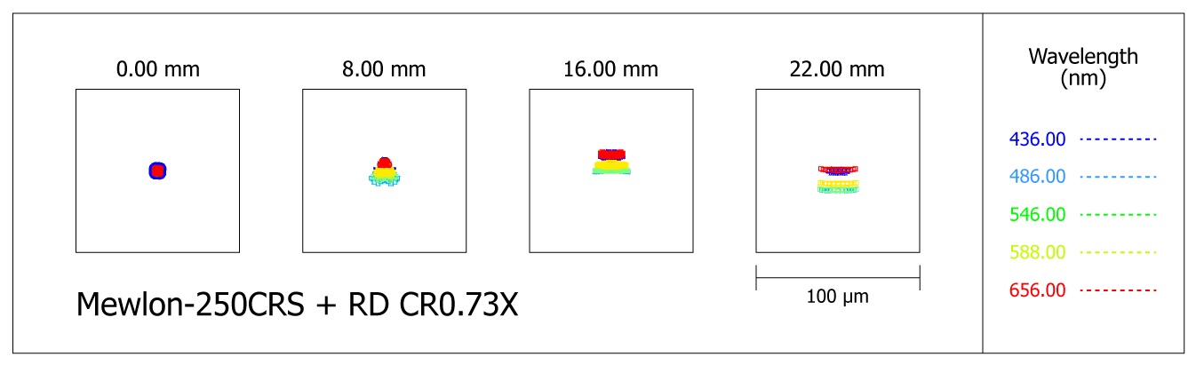 Das optische Prinzip ist ein modifiziertes Dall-Kirkham, dies ist eine Cassegrain Abwandlung mit einem ellipsoiden Hauptspiegel sowie einen sphärischen Fangspiegel. Der Hauptspiegel besitzt ein Öffnungsverhältnis von 3, der Fangspiegel einen Vergrößerungsfaktor von 4, was eine längere Brennweite ergibt. Allerdings besitzen die CRS-Geräte im Blendrohr einen Korrektor mit 3 Linsen in 3 Gruppen (1 Linse aus ED-Glas) und sehr großen Linsenabständen, der die Brennweite auf f/10 reduziert. Dieser Korrektor beseitigt den Koma-Fehler komplett aus dem System, ohne die Abbildung auf der optischen Achse zu verschlechtern. Außerdem wird das Bildfeld geebnet, am Rande eines Bildkreises mit 35mm Durchmesser sind die Spots nicht größer als 15 Mikrometer, ein Mewlon-CRS übertrifft ein herkömmliches Ritchey-Chrétien Teleskop.