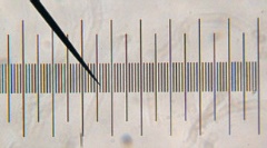 Objektmikrometer sind Hilfsmittel zur Größenbestimmung in der Mikroskopie. Sie sind praktisch eine Eichvorrichtung mit Strichmarkierungen im Abstand von 0,01mm für biologische oder 0,1mm für Stereo-Mikroskope. Den auf der Strichplatte befindlichen Maßstab verwendet man dazu, um zu bestimmen, welchem Abstand die Striche in einem Mikrometer-(Mess-)Okular entsprechen. Da ein Mikrometerokular nach Möglichkeit genau messen sollte, können Sie das mit dem Mikrogitter überprüfen und Ihre Ergebnisse gegebenenfalls mit einem Korrekturfaktor gewichten. Darüber hinaus können Sie auch überprüfen, ob Ihr Mikroskop z.B. tatsächlich eine 100-fache Vergrößerung liefert, oder ob die Vergrößerung eventuell etwas darüber oder darunter liegt.
