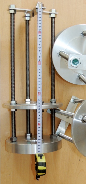 • die mittlere sog. Deck-Ebene ist eine 10mm dicke Vollmetallplatte mit 20cm Durchmesser. Diese Platte ist bereits sichtbar und bedeckt die Säule von oben. Die Gewindestangen sind mit Muttern sowohl von oben als auch von unten festgeschraubt. Nach der Einbetonierung sind nur noch die oberen Muttern zugänglich.