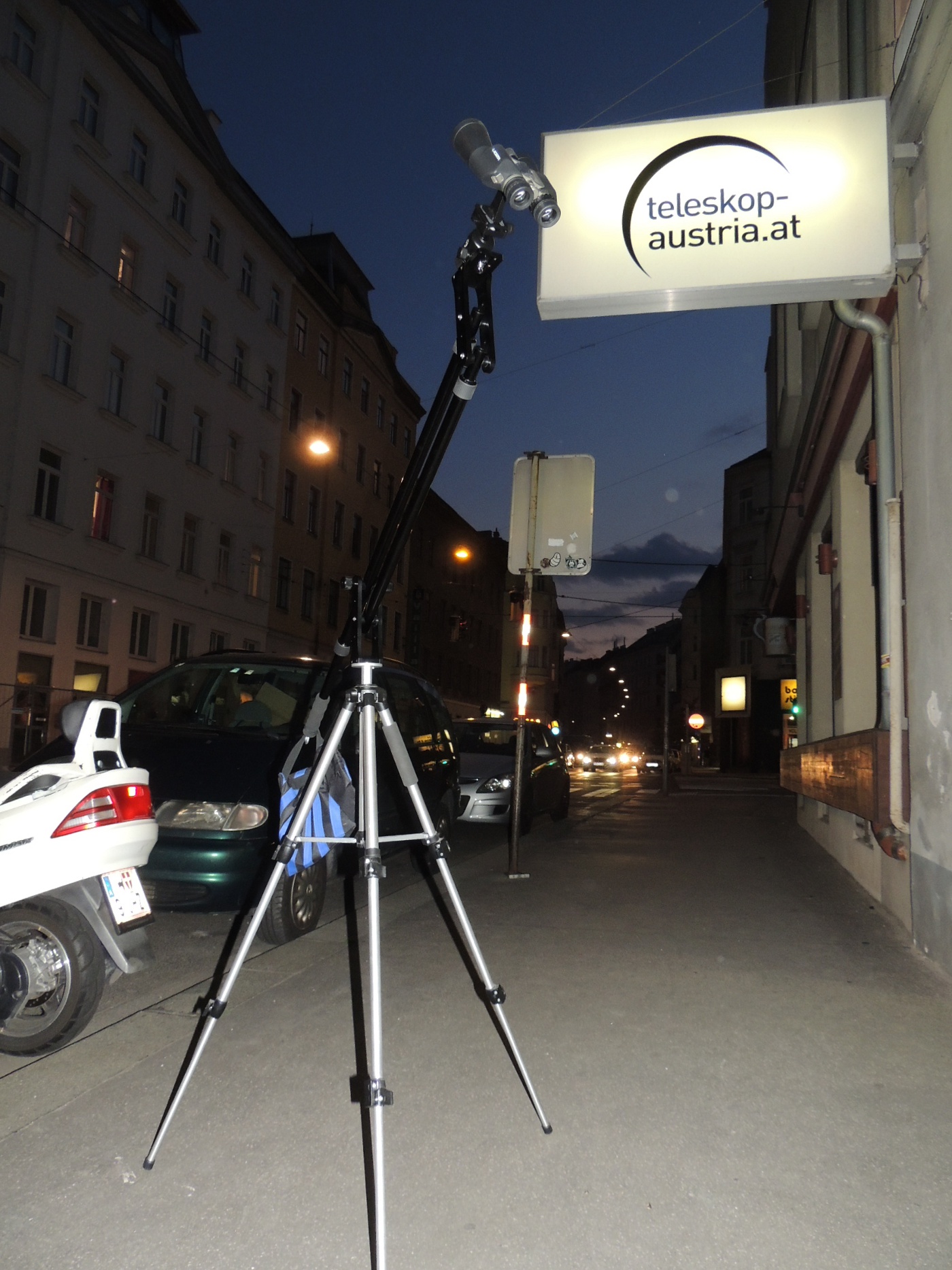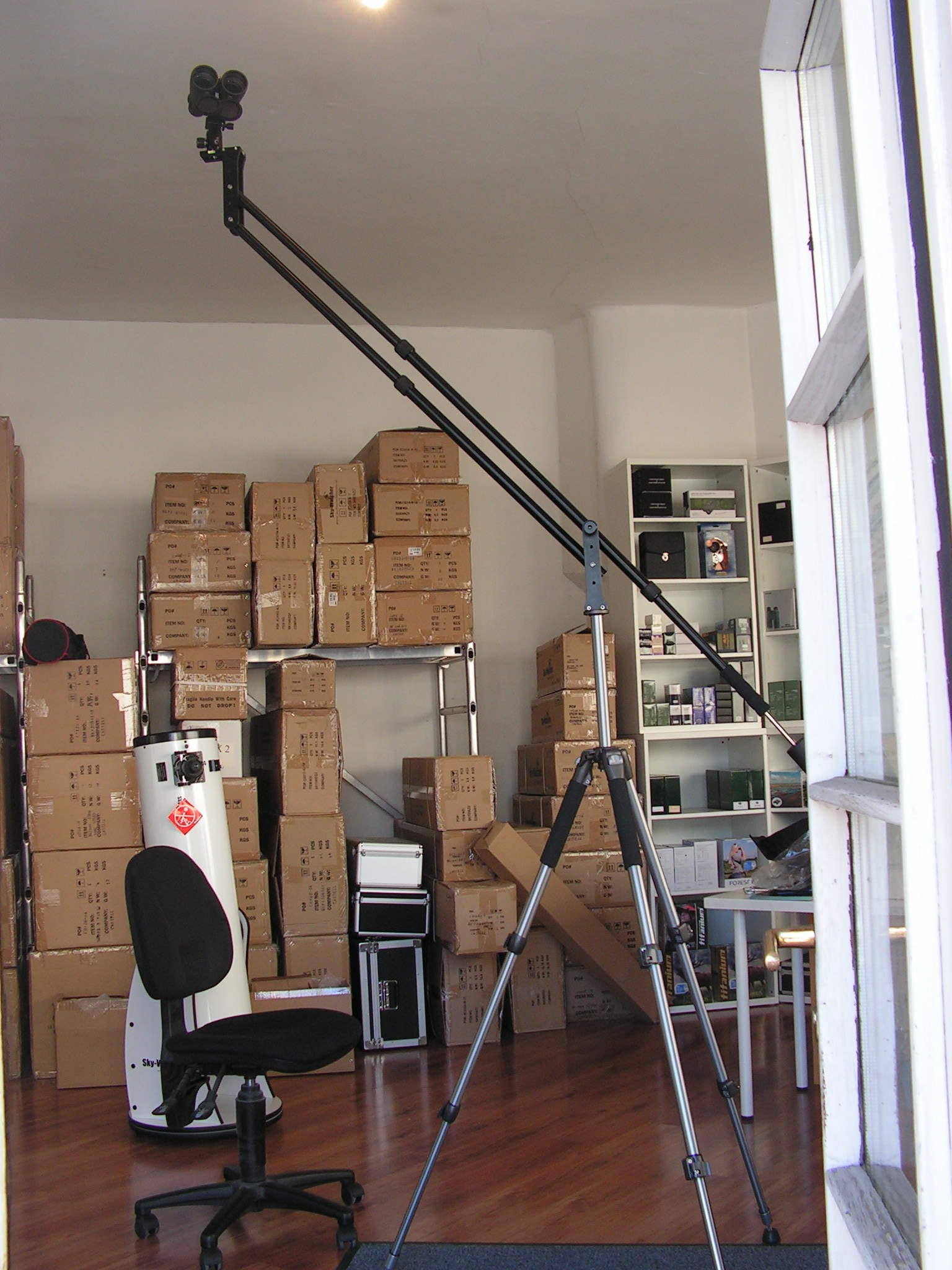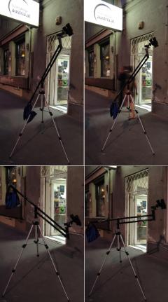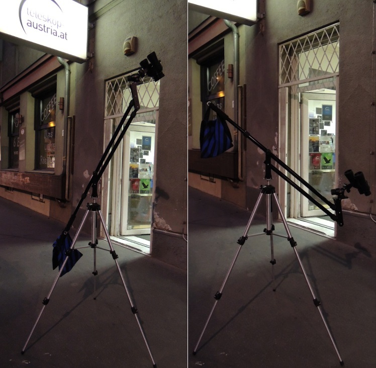 Die Parallelogramm-Arme sind ausziehbar, die Montierung hat auf der Plattform eine Wasserwaage, um den Horizont genau einstellen zu können. Die maximale Plattformhöhe mit ausgezogenen Parallel-Armen ist über 3 Meter!