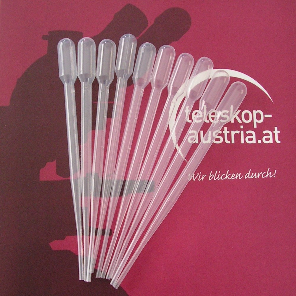 10 Stück Einweg-Pipetten aus weichen Kunststoff, die Pipetten haben bei 0.5ml, 1ml, 1.5ml und 2ml Markierungen.