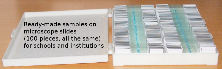 100 Stk. des gleichen Dauerpräparats auf Objektträger fixiert (Präparat nach Wunsch): Schulen und Institute haben oft Bedarf an einer Vielzahl gleicher Präparate zu Demonstrations- oder Übungszwecken. Wir erstellen Ihnen ein Angebot auf Wunsch, der angegebene Preis ist ein Richtpreis und gilt für einfache Präparate (zB. Zwiebel Epidermis, Lactobakterien, Mandibeln der Mücke, etc.) (Bild ganz oben)
