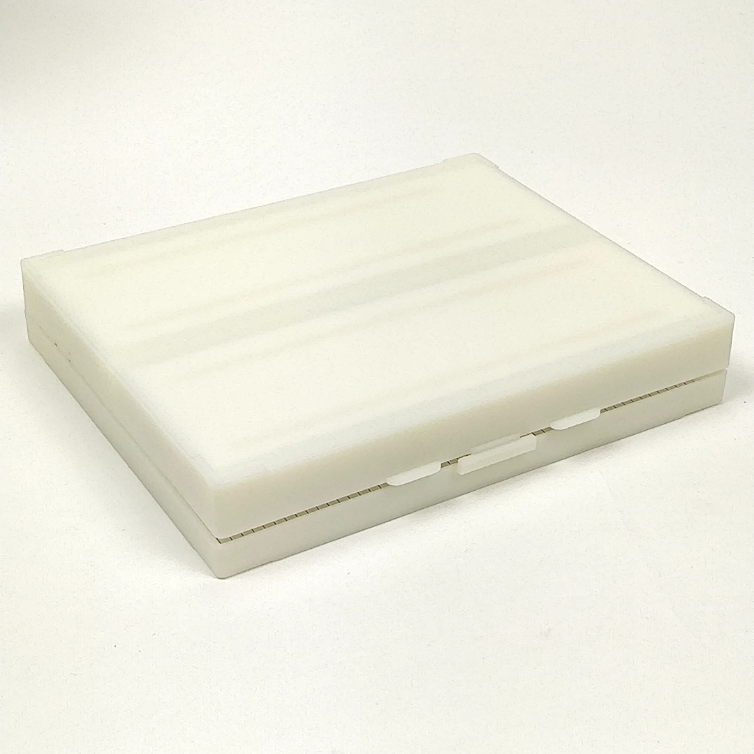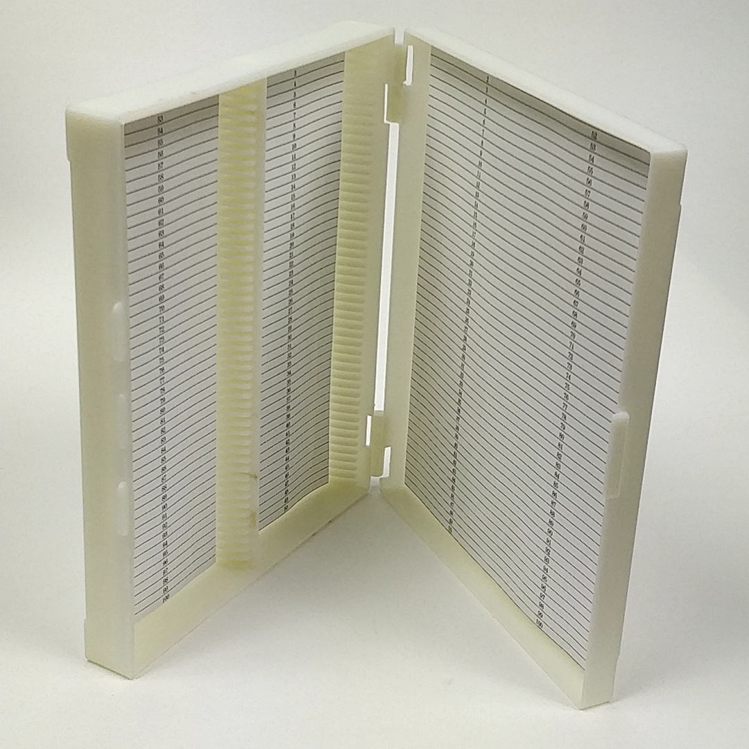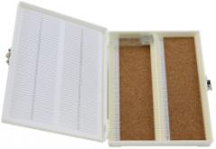Das Aufbewahrungsbox bietet Platz für 100 Präparate und ist aus starkem Kunststoff. Die kork Einlage schont die Präparate während dem Transport.