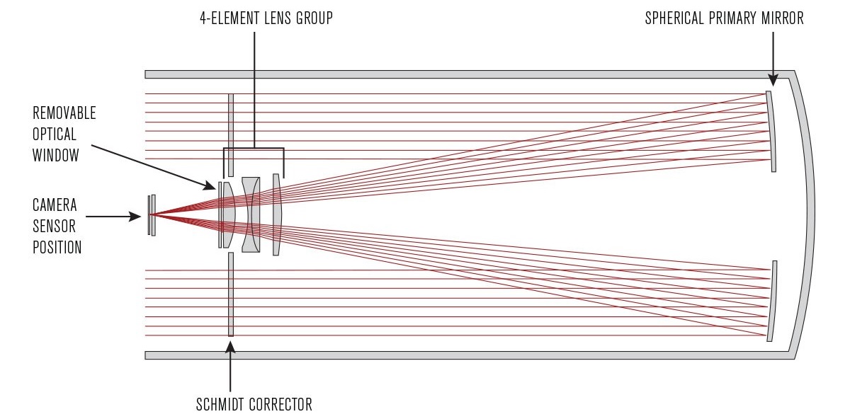 Der Rowe-Ackermann Schmidt Astrograph hat eine neu konstruierte Optik mit einem vierlinsigen Korrektor mit Gläsern mit seltenen Erden, die Farb- und Abbildungsfehler wie Koma und Bildfeldwölbung unterdrücken. Nie zuvor hat ein Astrograph in dieser Preisklasse über das gesamte Bildfeld diese optische Qualität und Spot-Größe geliefert. Die Konstruktion ermöglicht auch eine sehr geringe Vignettierung.