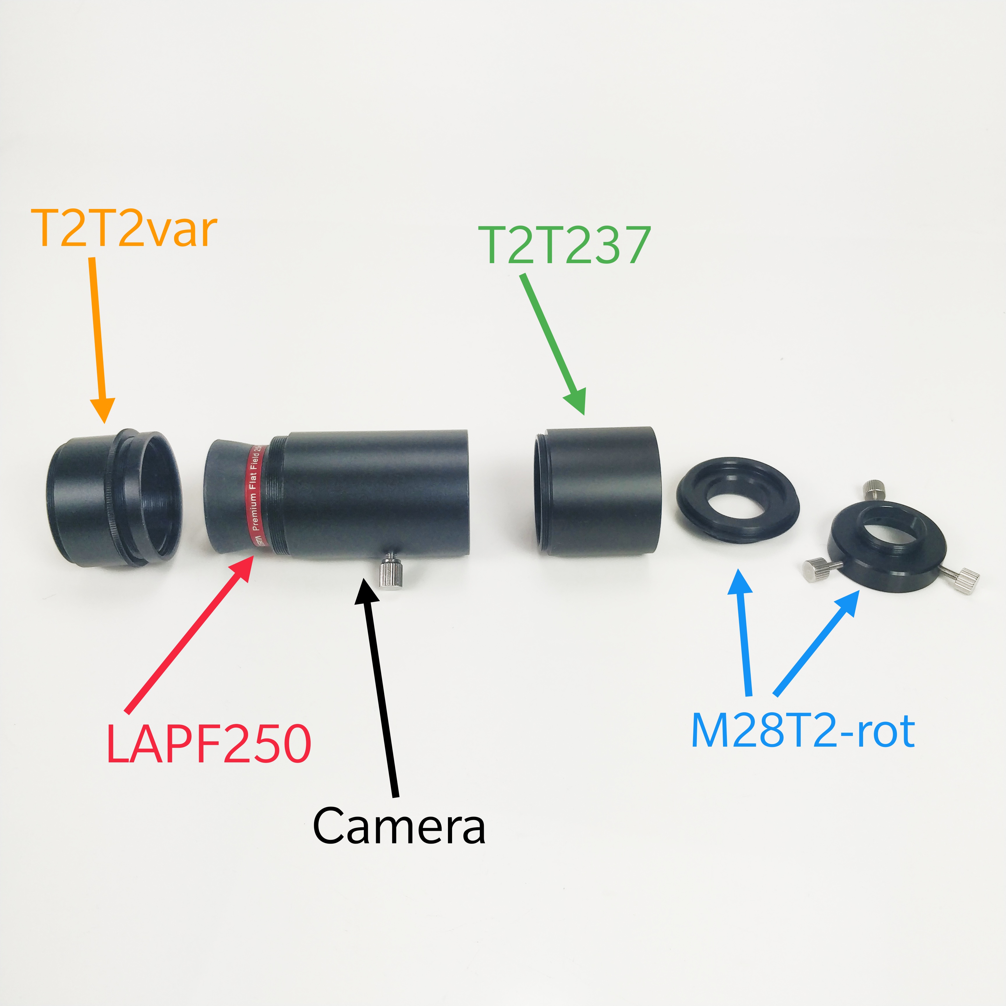 Komplett Adapterset für STM45T Mikroskop zur Fullframe DSLR Kamera. Das Set besteht aus M28T2-rot, T2T237, Camera-Adapter, LAPF250, T2T2var (T2-DSLR Bayonett für Ihre Kamera bitte dazu bestellen)