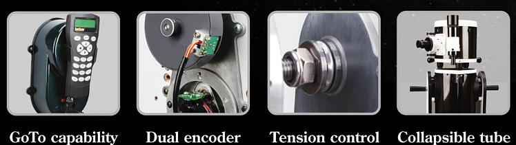 Diese GoTo-Dobsons sind in der Bauweise wie die normalen Flex-Dobsons, der Tubus kann zusammengeschoben werden, dadurch ist der Transport wesentlich einfacher möglich. Da der Tubus nicht zerlegt werden muss, bleibt die Justage erhalten. Die Rockerbox ist in beiden Achsen motorisiert, Encoder erlauben auch manuelle Schwenks, ohne dass das Teleskop die Orientierung verliert.