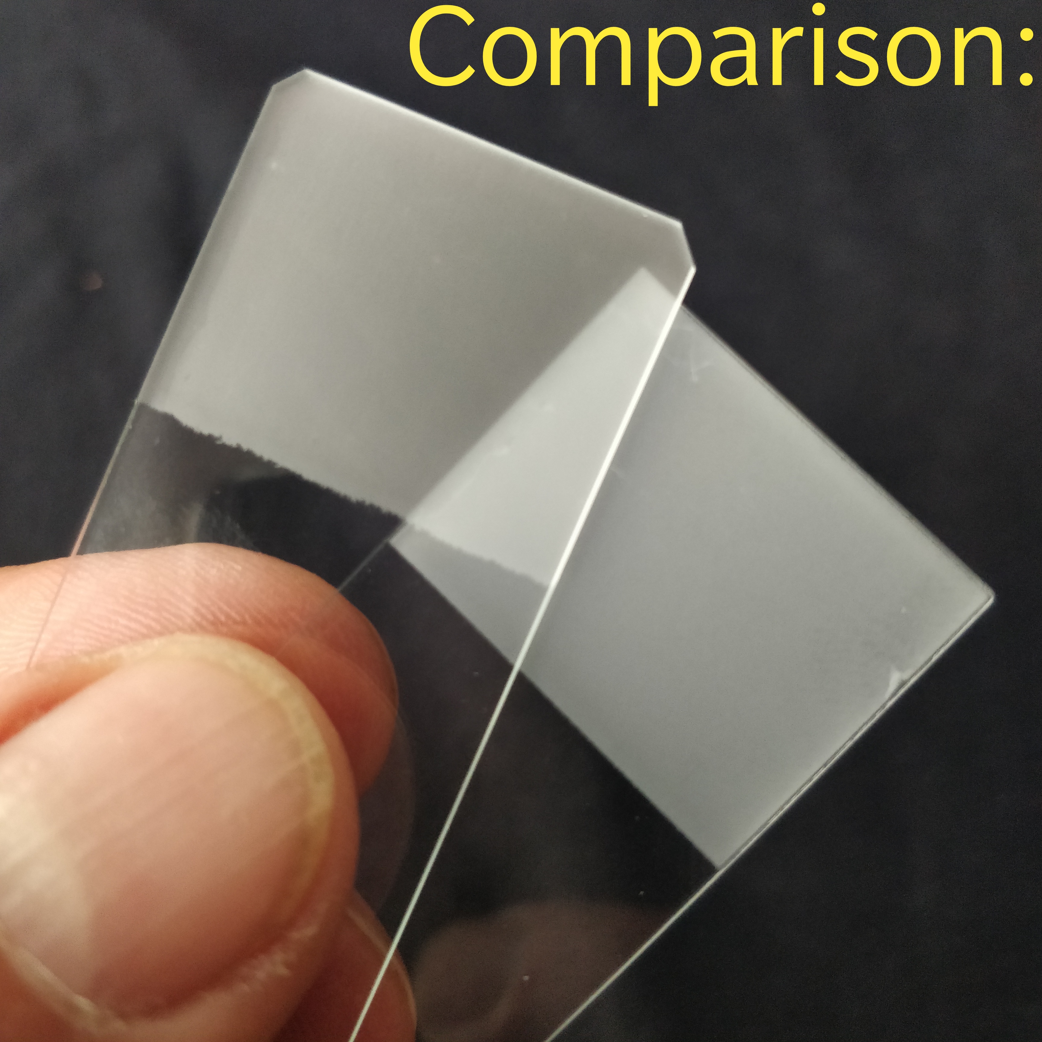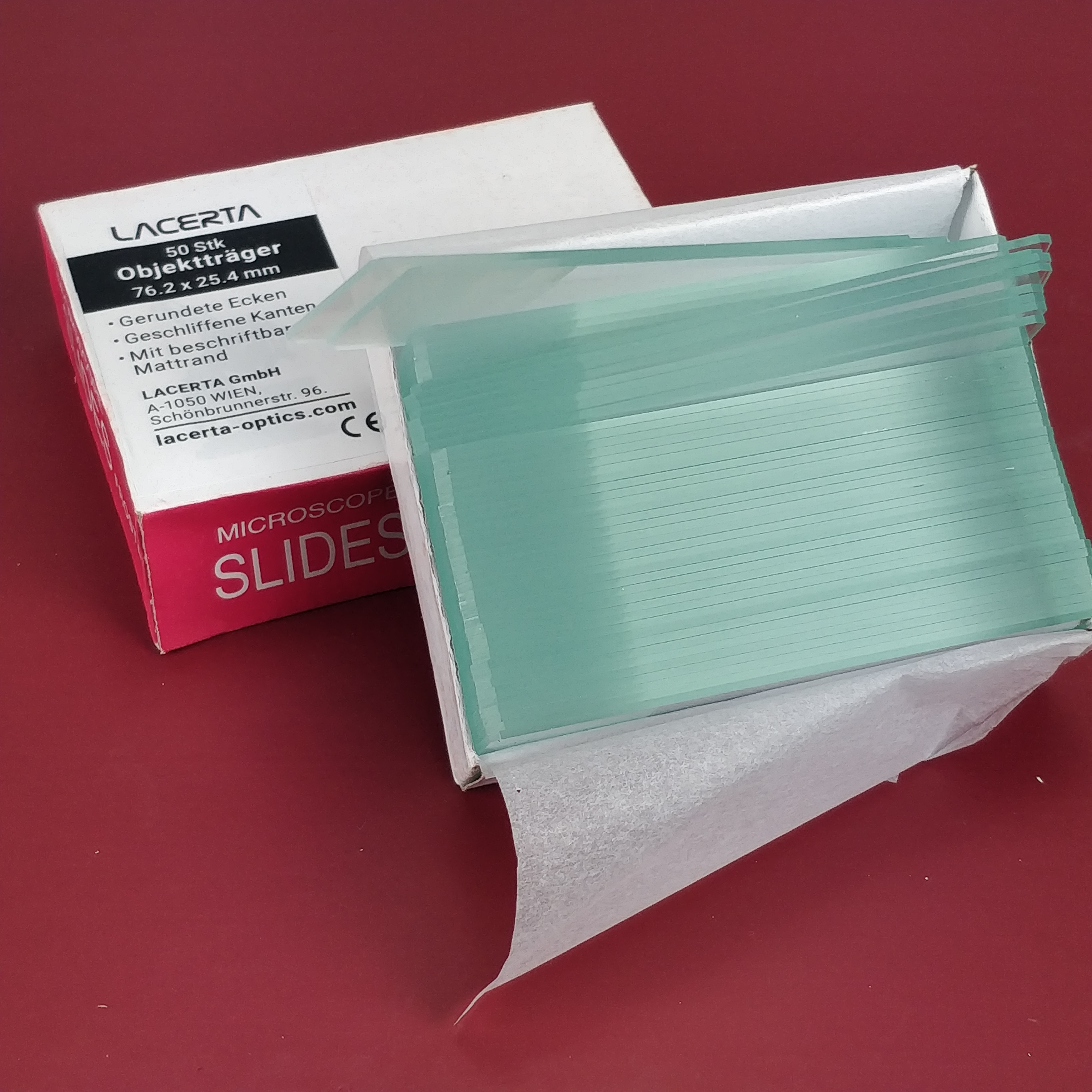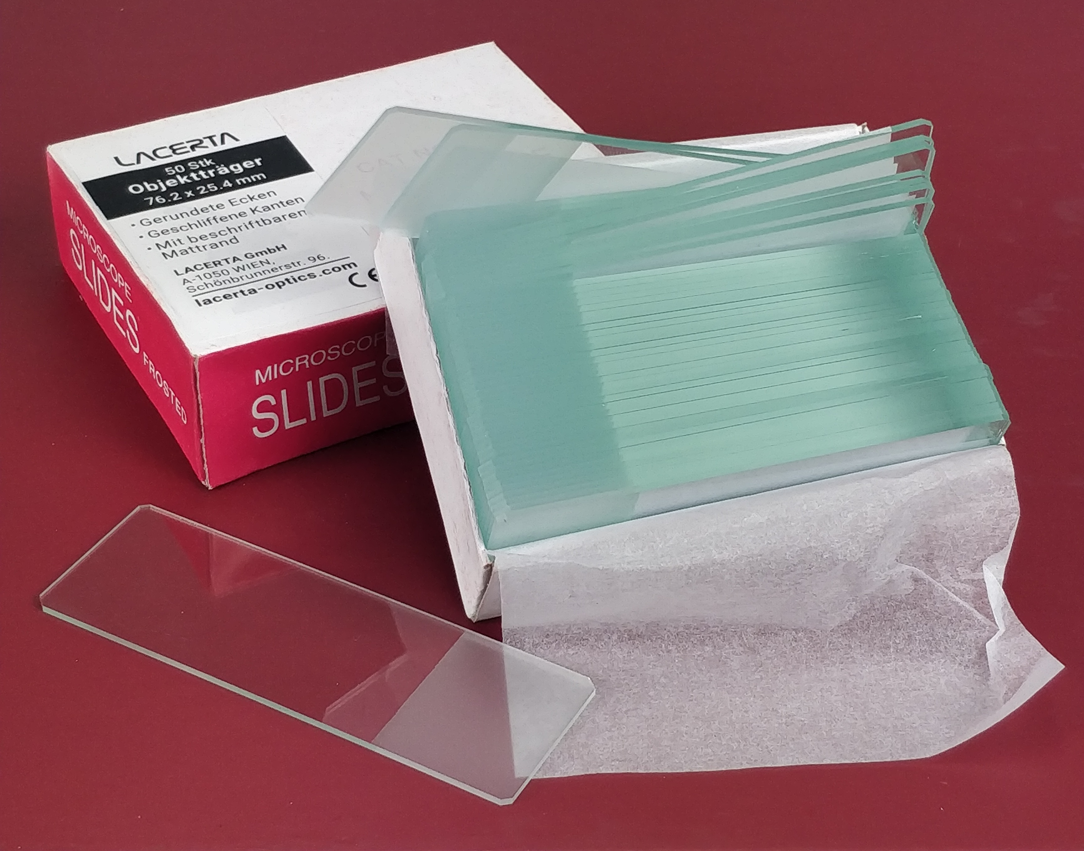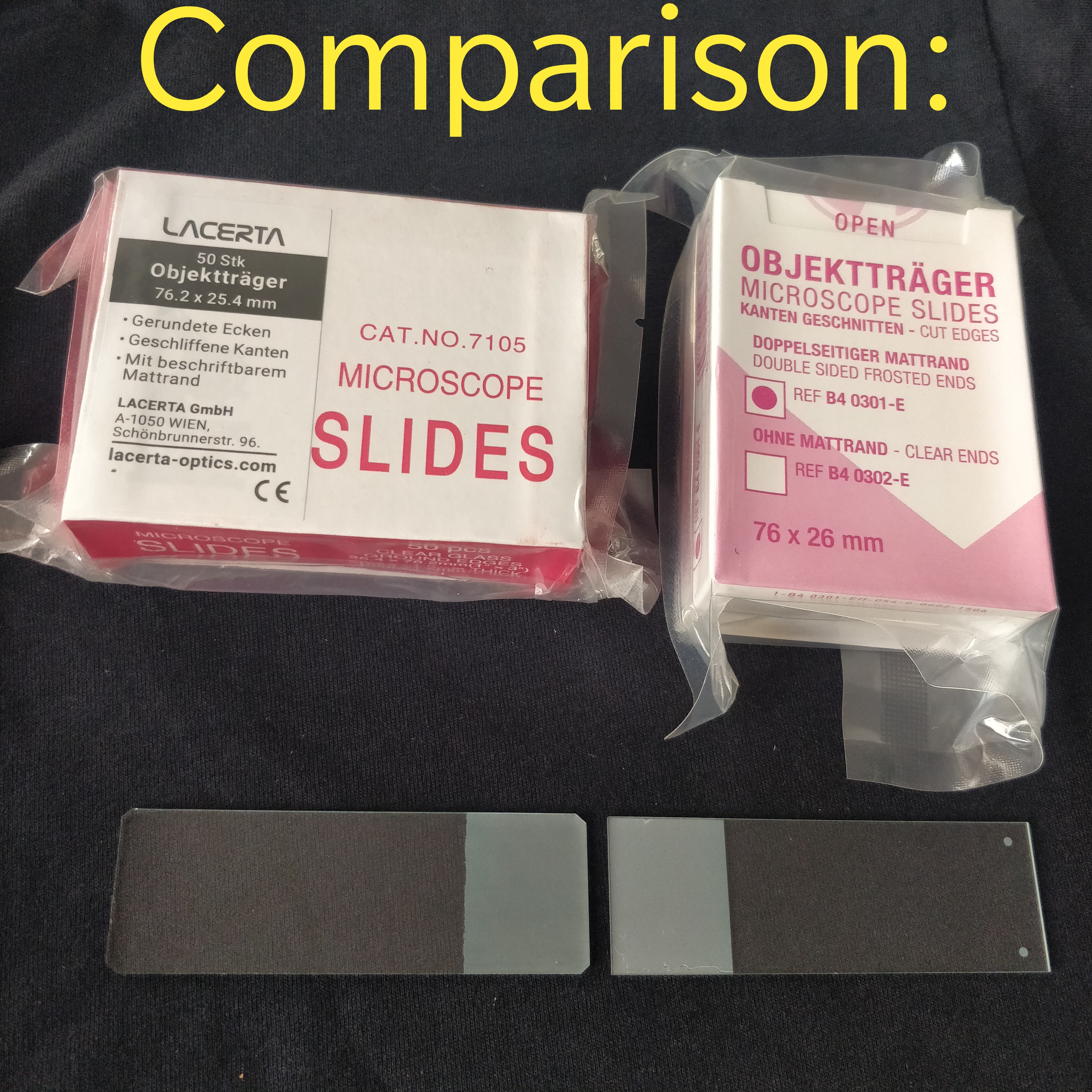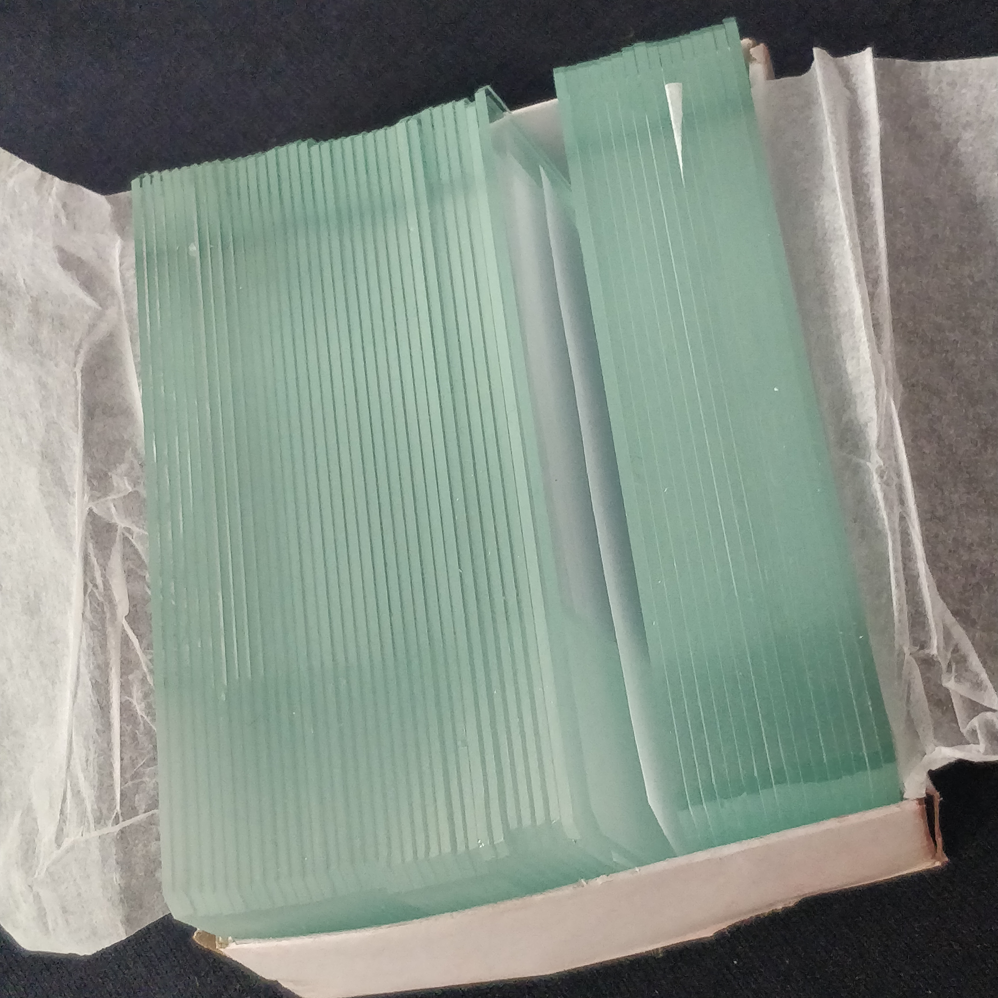 Diese Objektträger wurden nach unserem Vorgaben, mit abgerundeten Ecken und beschriftbarem Mattrand angefertig. Nach dem letzten Herstellungsschritt wurden die Objektträger nochmal gereinigt und sorgfältig verpackt: zwischen jeder Glasplatten befinden sich dünne Papierstreifen, damit die nebeneinander liegenden Oberflächen beim Transport keine Mikrokratzer erlitten. Er ist der teuerste und hochwertigste Objetträger in unserem Sortiment (ein Objektträger ist knapp 20 cent - im Vergleich kosten die preiswertere Objektträger etwa 18 und 15 cent)